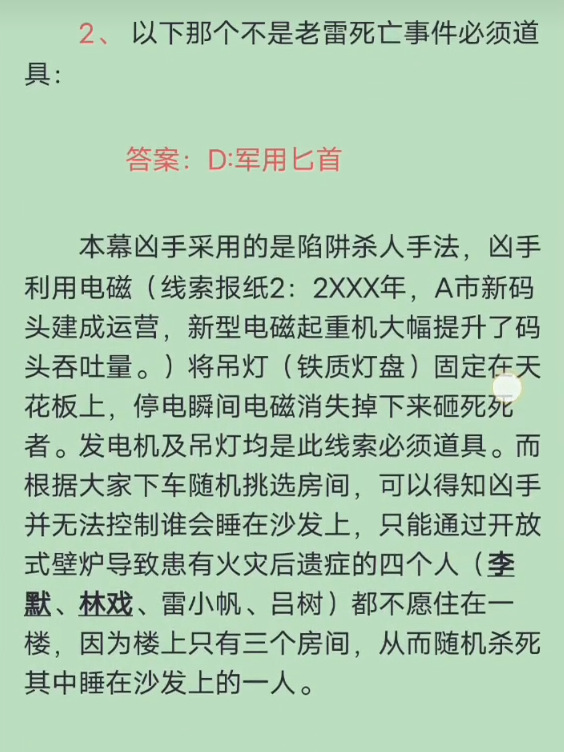 在老雷死亡的案件里,军用匕首是非必要的道具。因为杀害老雷所用的陷阱是电磁将吊灯固定在天花板,在停电瞬间吊灯掉落砸死受害人。之所以用不到军用匕首,则是因为这个陷阱必须提前布置好,所以是没法利用军用匕首杀人的。