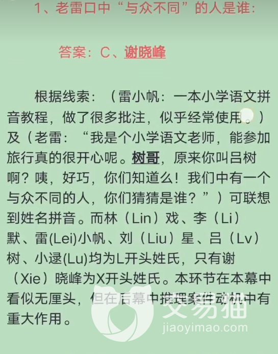 余烬这个本是一个5人的硬核推理本,主要是围绕雪山上所发生的事件进行推理。首先,第一个谜题,老雷口中与众不同的人其实是谢晓峰。因为所有人的真名的姓都是L,只有谢晓峰是X。