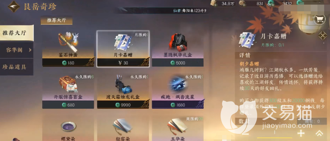 在目前的逆水寒手游当中,推出了一个价值30元的月卡。这个月卡玩家可以自己购买使用,也可以买了赠送给其他玩家。当玩家购买生效之后,每天登录游戏就可以领到玉和铜钱,但是数量比较少。