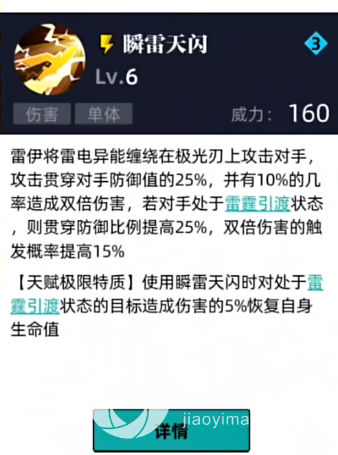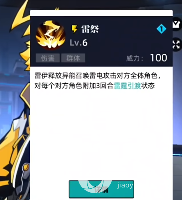 雷伊自身的核心技能是他的二技能,二技能雷祭可以释放异能召唤雷电攻击敌方全体角色,对每个角色都会附加3回合的雷霆引渡的状态。这个状态你可以把他看做是麻痹,会让敌人的技能有一定几率放不出来。