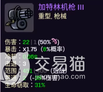 加特林机枪属性介绍:武器类型:重型、枪械;伤害:紫1(50%远程)、红3(75%远程);暴击:紫x1.75(1%概率)、红x2(2%概率);冷却:紫0.09秒、红0.06秒;范围:400;击退:3;效果:贯通1(-50%伤害)。