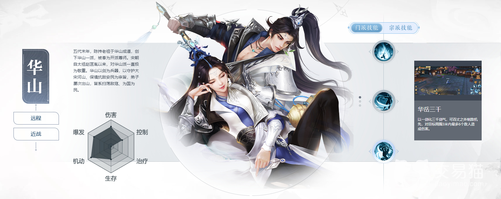 第3个门派,华山派这个门派以剑法为主,是非常灵活的,主要以高输出和闪避技能为主,他们的基础技能是华山剑法、天外飞仙、紫霞内功等等,使用这些轻功和剑法可以提高自身的伤害,闪避和攻击能力。