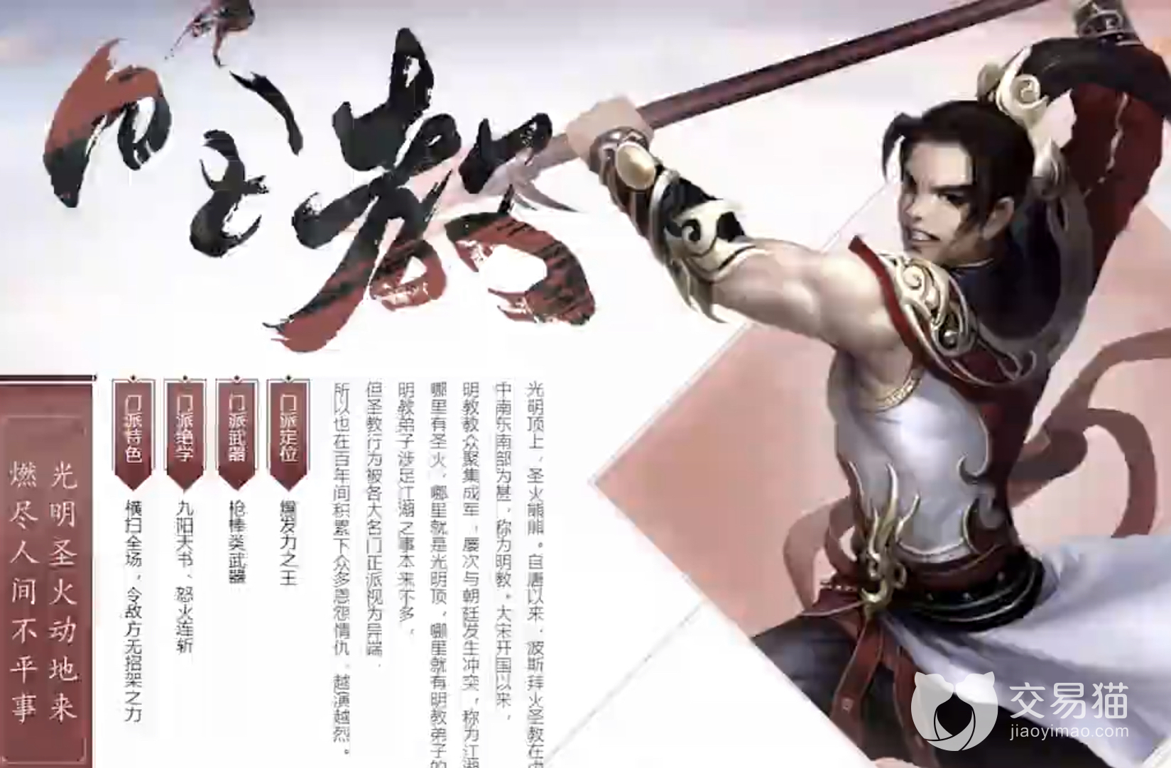 第4个门派明教,作为魔教门派,它拥有大量的高输出能力和控制技能,基础技能为明教拳法,明教剑法明教内功,使用这些拳法,剑法和内功可以提升伤害和高额暴击。