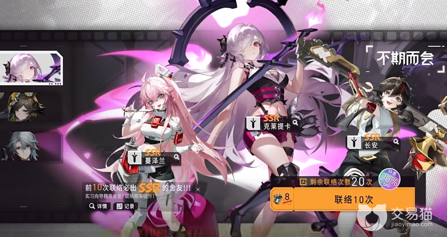 新手卡池一共只有20次抽卡机会,给新手8折折扣,抽10发只需联络8次即可。提供三个保底SSR角色,前十发必定出这三个角色中的一个,20次联络消耗光了,卡池也随之消失。看到这里大家应该很清楚了,新手池不要太划算,必抽。