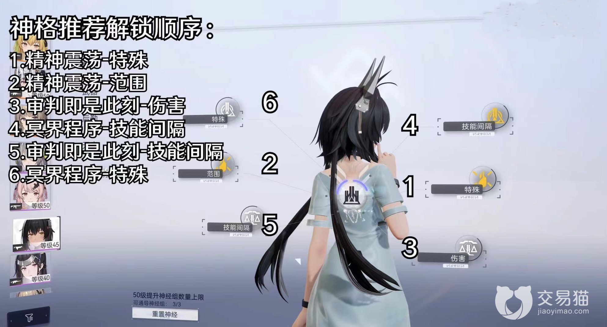 因此,在猫汐尔的神格解锁上可以参考:1-特殊(精神震荡);2-范围(精神震荡);3-伤害(审判即时此刻);4-间隔(冥界程序);5-仅能间隔(审判即时此刻);6-特殊(冥界程序)。按照这个神格点击顺序可以很好的提升猫汐尔的技能效果。