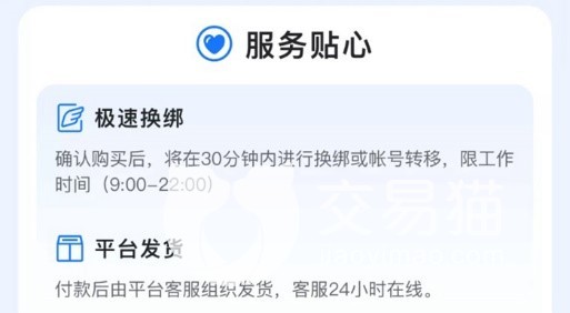 另外平台的整个交易过程是十分的省心、安全的,都是会有着客服守护着我们的,当我们确认购买账号之后,账号的转移并不是由卖家为我们进行换绑和账号的转移,都是由平台的客服进行的,可以避免我们购买的账号在转移的过程中出现账号内容丢失的问题,并且客服的转移是十分的迅速的,发货也是统一由平台客服组织发货的,若是我们有任何的问题,都是可以随时随地找寻客服的,因为客服都是全天在线的。