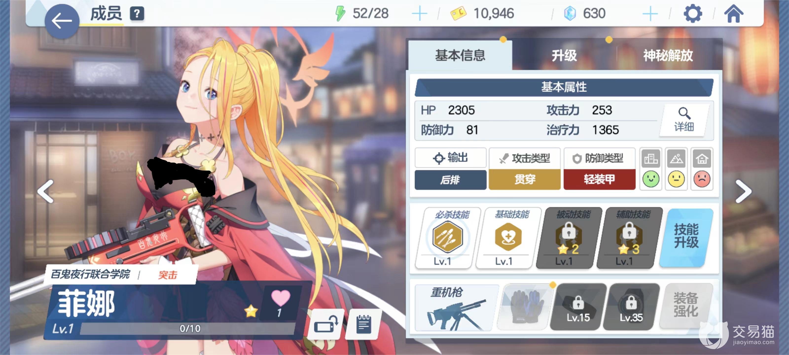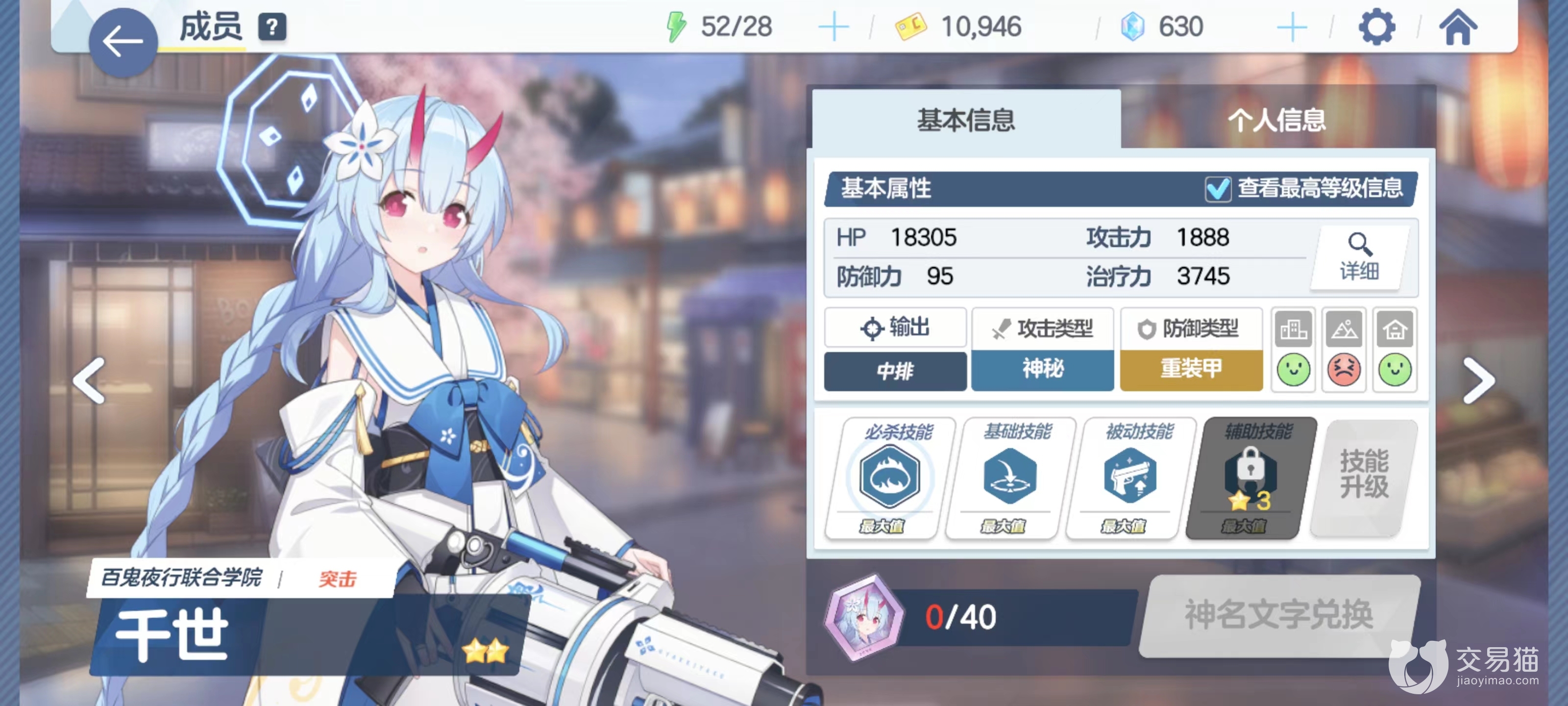 椿:这是二星坦克角色,满级的基础生命值突破四万,成功跻身一线前排水平,不过144的防御还是有些不够用,1461的攻击可以说完全用不上,3694的治愈力倒是可以配合一些回复技能来提升自己的续航。