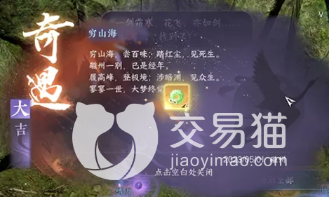 之后玩家可再次传送到瀑布这一次玩家的任务是组队打败石门里面名叫刀狂的大怪兽,打败boss之后会获取宝箱得到开启第二道石门的钥匙。玩家开启第二个石门后会看到里面也有一个宝箱,点击宝箱会出现一只美丽的蝴蝶,玩家会受到提示要求我们跟着这只蝴蝶指引找到第三个宝箱,打开后玩家便能获得技能繁花一梦结束奇遇【穷山海】。奇遇【穷山海】较为繁杂,玩家需要有一定的技巧才能顺利通关。