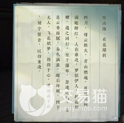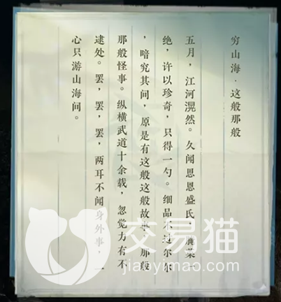 玩家在游戏时经常会遇到一些卡壳。例如如果想要继续推进任务玩家必须先获得穷山海紫色装备,在打石门环节玩家必须自己开门否则会卡住,在进入石门之后因为里面没有光线玩家可以采集旁边的萤火得到技能萤火微光使用它进行照明。有一些玩家在跟着蝴蝶的环节会想直接开宝箱,这种做法会导致任务卡住。正确的做法是跟着蝴蝶先找到四张纸条根据上面的指引最后就能得到绝技并完成奇遇【穷山海】。