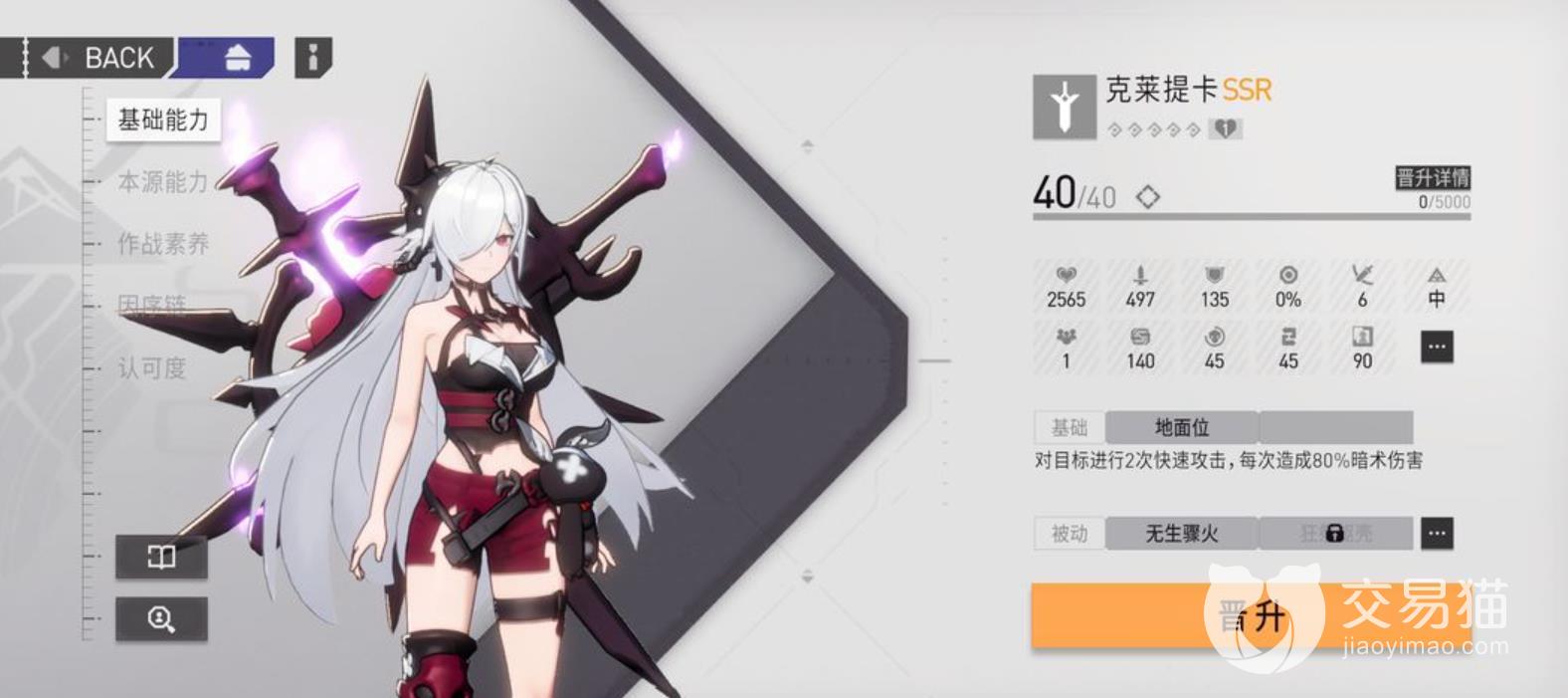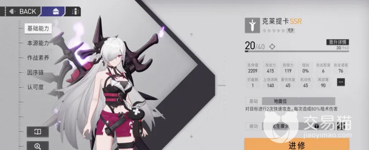 第三个拥有完整资料的人物,名为极乐,这个人物的来历十分特殊,她并不是克莱因斯的直属部下,她的一举一动都是按照自己的意志行事,这是因为她是一名来自异域的公主,她的身体素质很好,不喜欢受到束缚,定位是主c,她的能力是高台物理职业,她的武器可以对一定范围内的敌人造成一定的伤害。她的第一个技能是隐身,攻击速度会减慢,但是伤害会增加,第二个技能是一只释放飞鸟,飞鸟会对目标造成很高的物理伤害,而且还会对目标造成一定的限制,让目标的技能冷却时间延长。