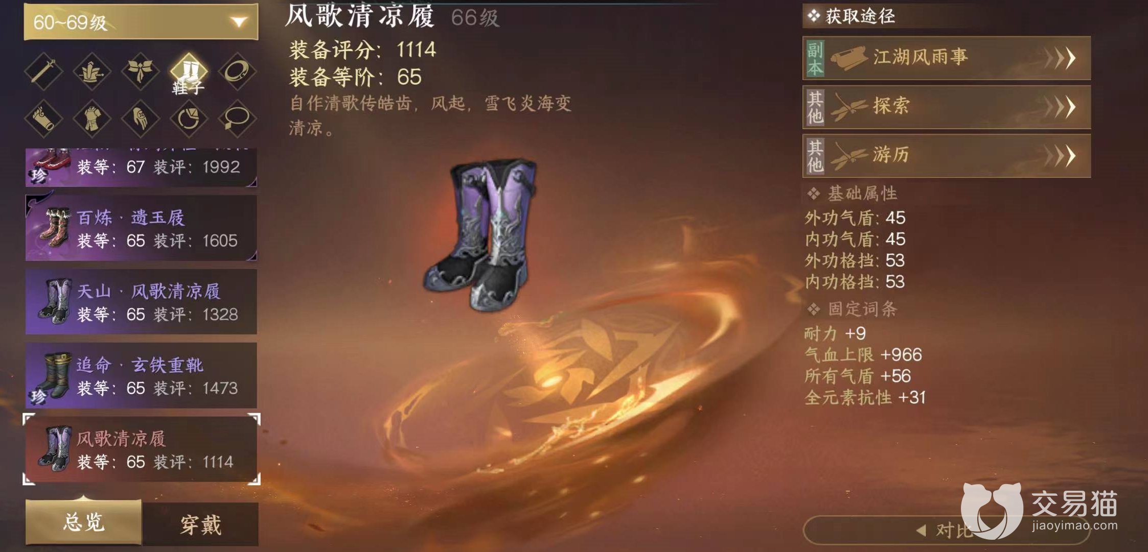 鞋子【风歌清凉履】这个装备是需要等级达到66级的时候才可以进行佩戴,评分是1114点,获取方式主要是在江湖游历中获取,基础属性:外攻气盾增加45点和内功气盾增加45点,增加外功和内功格挡53点,固定词条:耐力增加9点,增加966点气血,增加所有气盾属性56点,全元素抵抗增加31点。