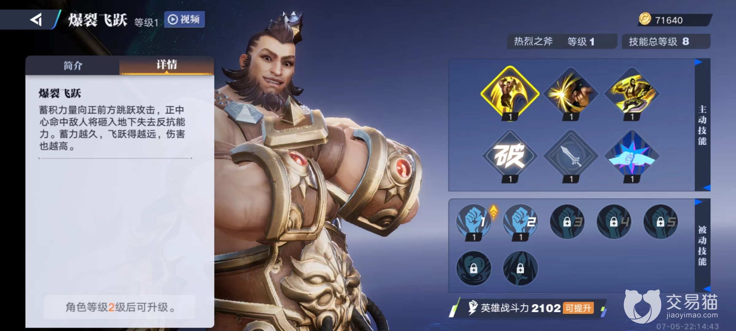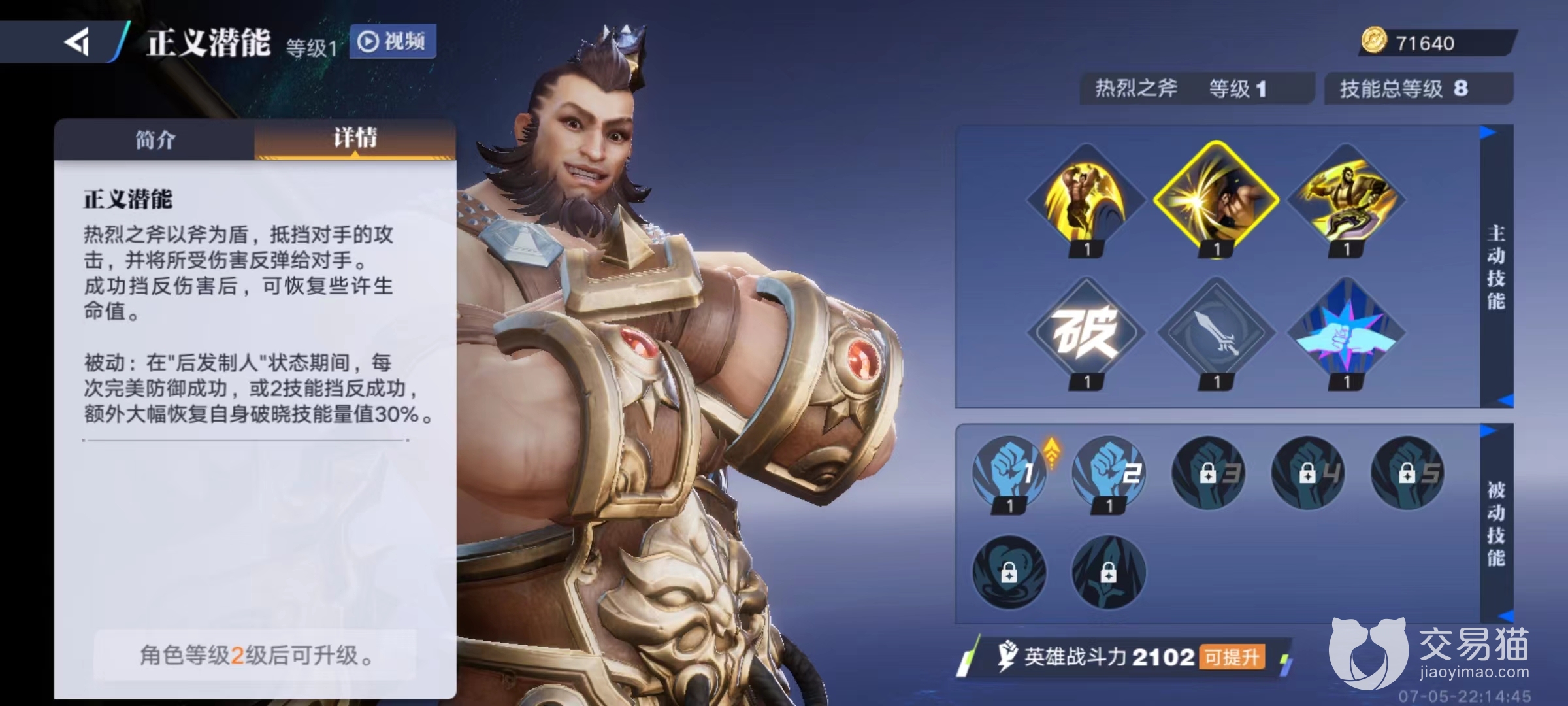 该英雄在外形方面和王者里程咬金非常接近,同样是使用两把大斧,第1个技能爆裂飞跃,在地面时通过蓄力来提高释放的距离和伤害,砸向目标地点中心位置,将敌人砸入地下,如果在空中释放则是向下猛砸,同样是依靠蓄力来提高伤害。第2个技能正义潜能,将手中的大斧子化作盾牌用于抵挡对手攻击,并且将受到伤害反弹回去,如果格挡和反弹成功,自身还能恢复少量生命值。
