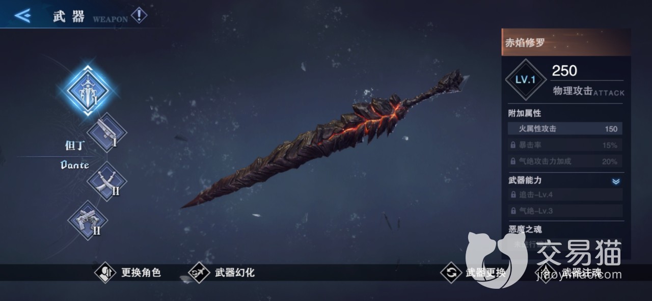 对于但丁来说,是非常推荐使用大剑的,而大剑类武器在游戏中有两种非常强力,首先是赤焰修罗,作为火属性的一把高品质武器,在等级不高的时候就可以拥有非常高的物理攻击力白值属性,以及自身最值得一说的火属性攻击数值和暴击率,这些属性对于武器的装备者但丁来说非常强大。当玩家们将这把武器升级到一定的程度后还可以解锁新的属性加成——20%的攻击力,对于狂堆攻击力的但丁来说无比契合,在游戏中发挥出来的效果也是震撼观者之心。可以说是但丁的最强武器之一了。