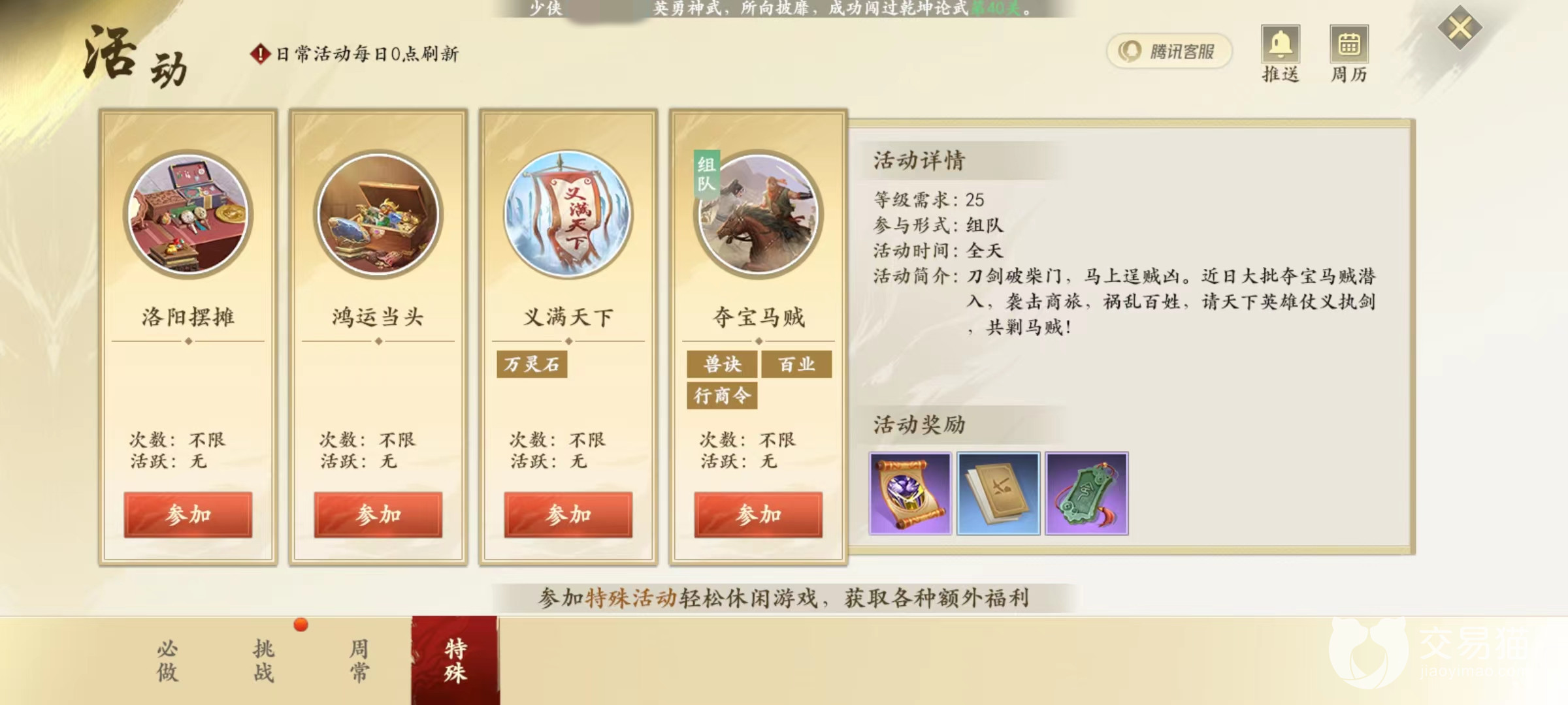 这项活动只需要25级就可以全天候参加,但也要和其他玩家组队,单人即使找到了马贼,点击也不会进入到战斗中。出现的情况就在玩家进行挖宝时候,有一定几率触发夺宝马贼,这时世界频道上会直接进行公布,但不会出现具体刷新坐标,而以地图形式来播出。例如在镜湖、大理或是其他地方出现大批夺宝马贼,玩家就可以组队前往这些地图寻找。