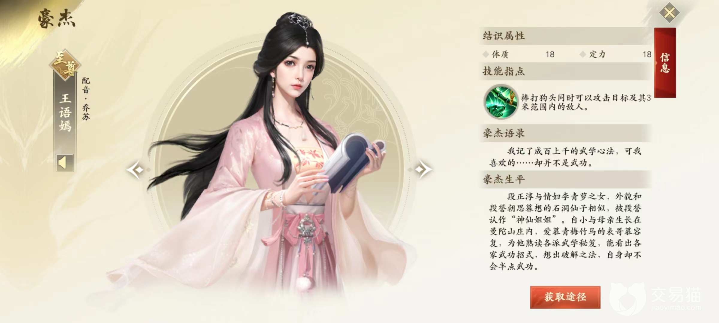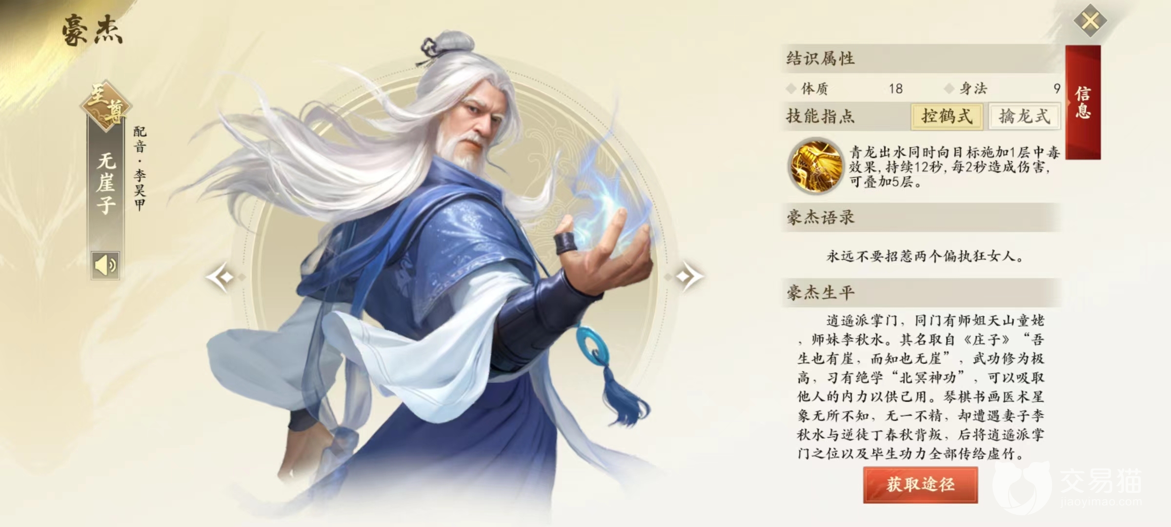 要想结识这些豪杰,只需要获得相应的拜帖就能激活。李秋水在帮会商店中直接购买到,但需要百物坊提升到5级,而且要消耗7200点帮贡,所以是高级帮会象征。扫地僧则需要完成少室山主线任务就会直接赠送。无崖子在武道阁直接购买,需要通关到190层才会开放,也是高端玩家象征。除了这三人之外,乔峰是在累计登录活动中直接赠送,虚竹为武道阁购买,但需要160关就能买到,天山童姥在飘渺峰主线任务后获得,段誉为帮会商店购买。