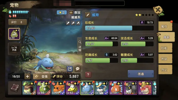 1、技能效果:提升自己的血量,若我方有同系宠物在战场的话,则结束阶段时会有57%几率恢复本回合亏损的66%的血量。若结束阶段血量高于或等于回合初血量的时候不触发。受到治疗时有50%几率对自己附加治疗效果,维持3回合。若已经有治疗效果,则直接结算治疗作用。“治疗”结束时,恢复触发治疗时50%的治疗量。