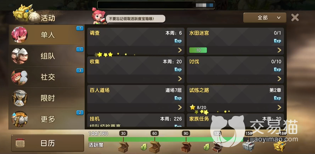 5、周任务:除了上述的这些任务外,还有还有一些每星期只能做一次或者几次的任务,这些任务称之为周任务。周任务的种类会比较多,比如家族任务(每周能完成20次)、讨伐任务、收集任务、做最强小队、调查任务等等、宠物列传,上述的这些任务都是有次数限制的。如果是氪金玩家的话,那么可以考虑买一下月卡,可以增加某些任务的完成次数。