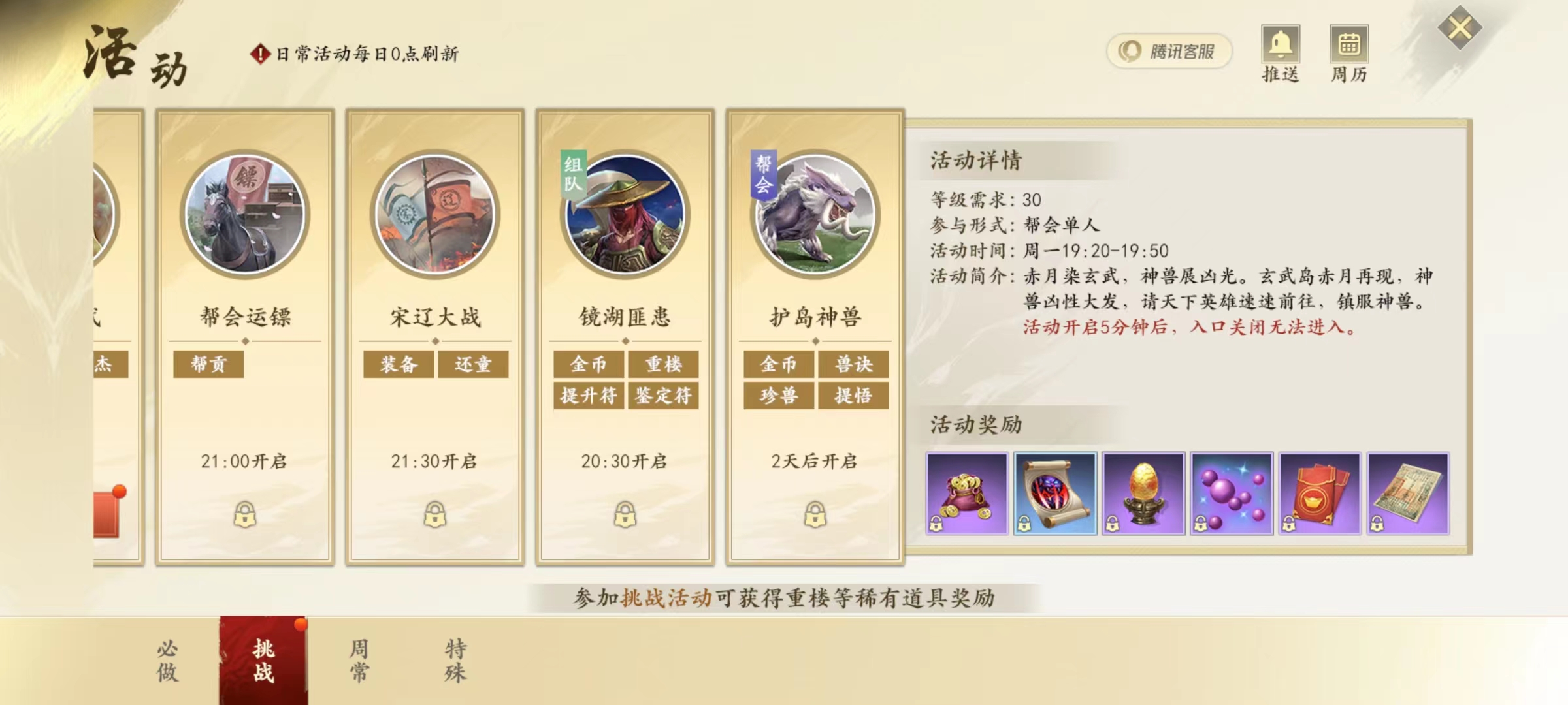 这项活动属于挑战玩法之一,只有在每周周一才会开放,而且时间很短,为7:20~7:50,只有半小时时间。所有等级达到30级以上玩家都能以帮会单人形式去参与。玄武岛是玩家非常喜欢去的地方,但是在这一天因为赤月再现,所以护岛神兽凶性大发,必须天下英雄共同前往一起将其降服。该活动在战斗方面没有太多需要讲述的地方,硬件不达标根本在护岛神兽面前扛不住几个回合,所以一定要根据自己实力去选择。