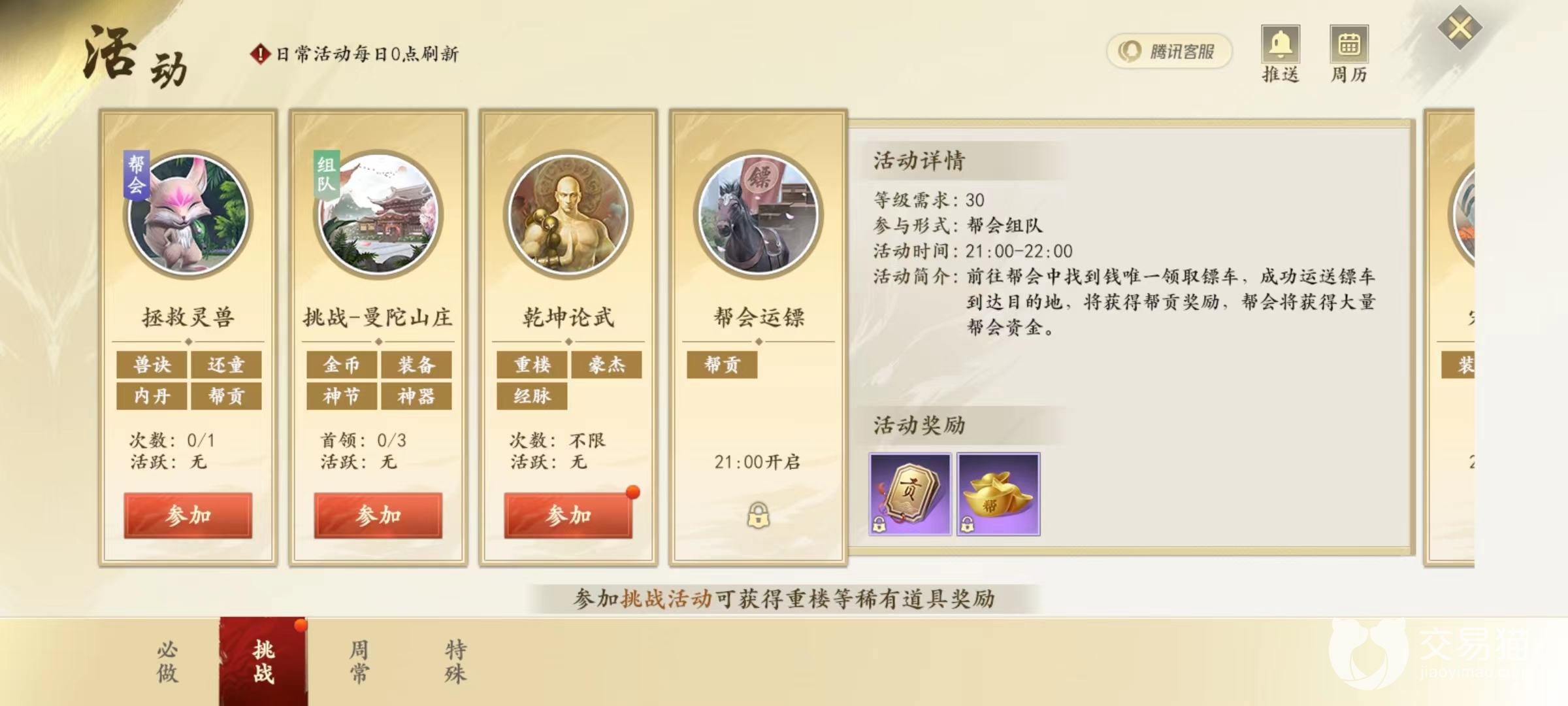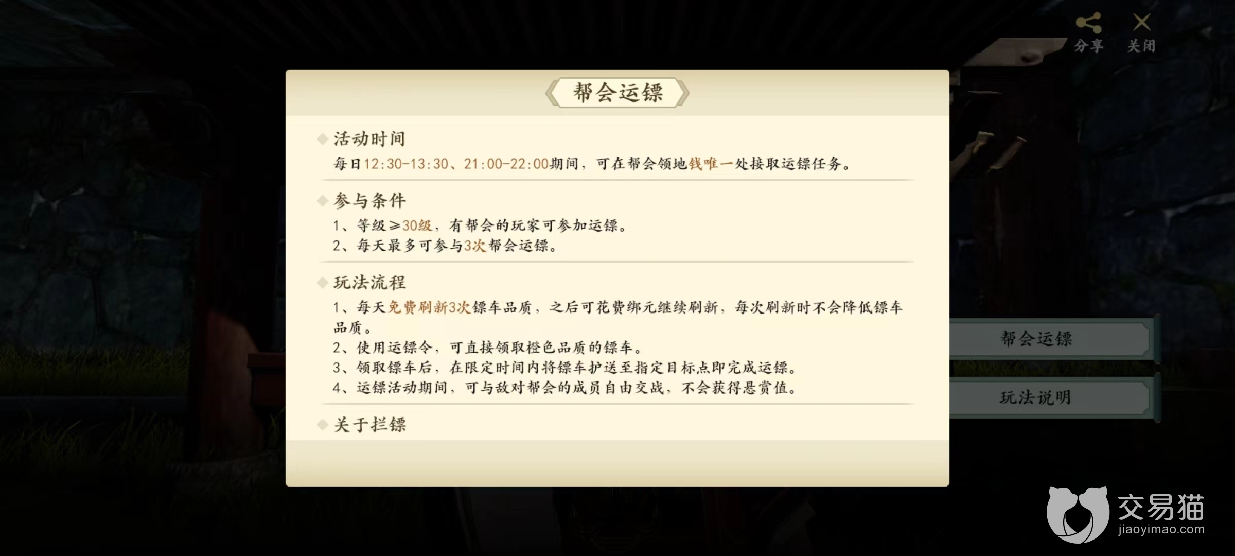 该活动属于限时开放类型,需要帮会成员之间组队才能参与到运标活动中,只要等级达到30级都能够前往参与。每天12:30~1:30这一时间段,在帮会中找到钱唯一可以领取镖车,如果能够将镖车成功运达目的地,就能获得大量帮贡奖励。该项活动之所以对方会非常重要,除了可以给成员提供奖励之外,帮派自身也能达到大量资金用于建设或者是升级。所以运镖是和跑商同等重要活动,必须每天积极参与。