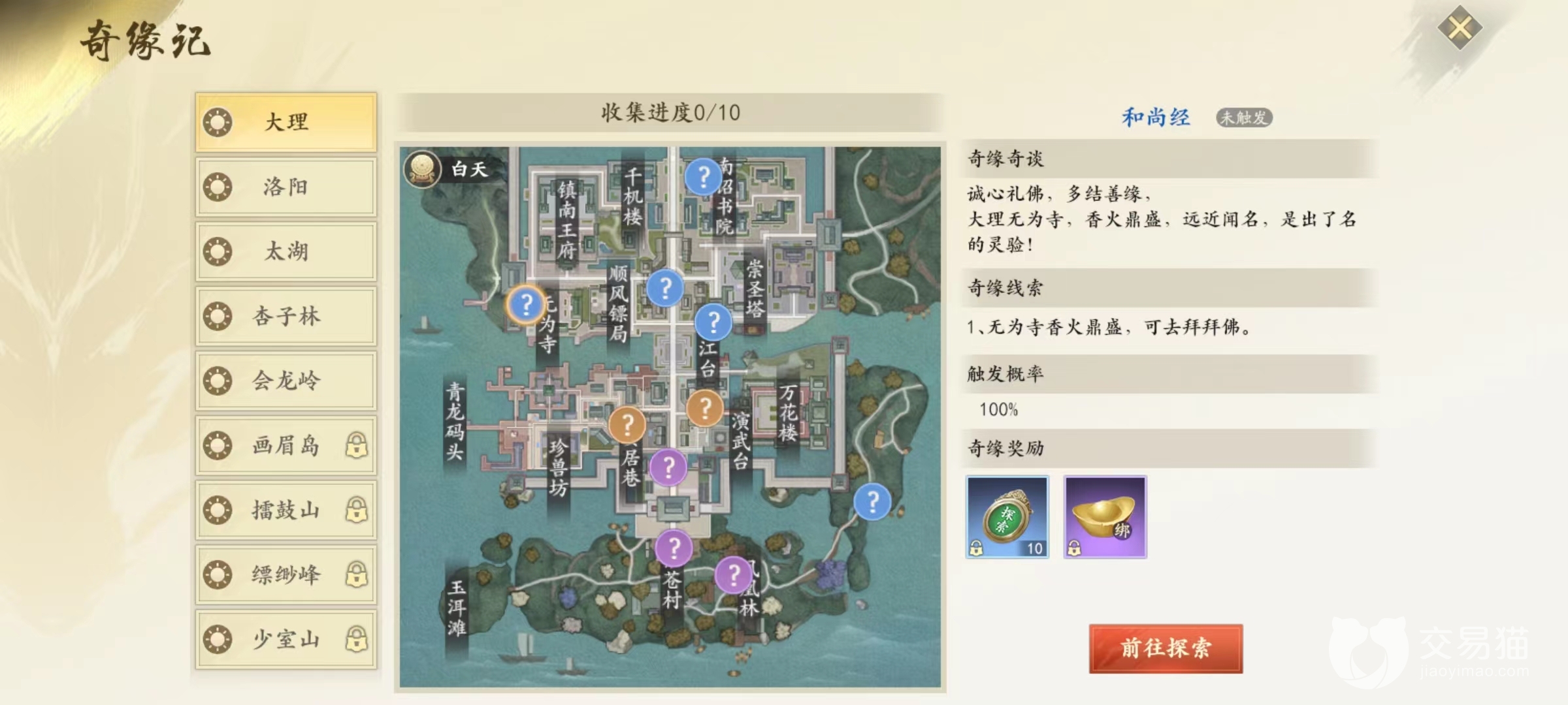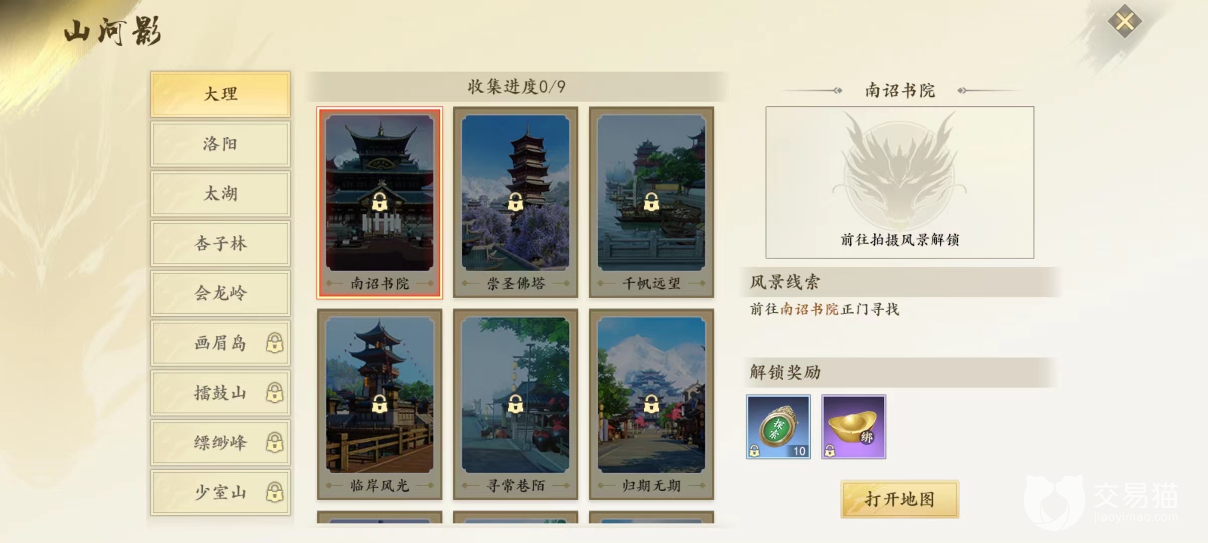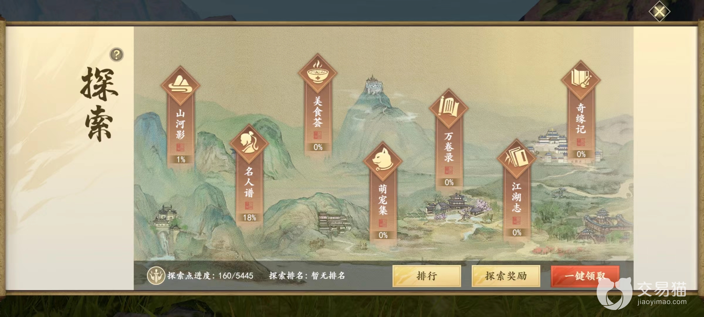 在游戏主界面中可以直接找到相应探索玩法,这里面有着很具体要求,而不再是自己在地图中到处乱撞。探索包括山河影,名人谱,美食荟,萌宠集,万卷路,江湖志和奇缘记等不同方面。不同类型在完成需要的条件上也有着很大不同,其中山河影就是让大家去收集每个地图中的美景,例如大理,洛阳,太湖,杏子林等都有很多漂亮的地方,点击进去以后就可以看见风景线索,按照线索来到指定位置,打开拍照功能,按照要求去进行风景拍摄,就能够直接解锁奖励。
