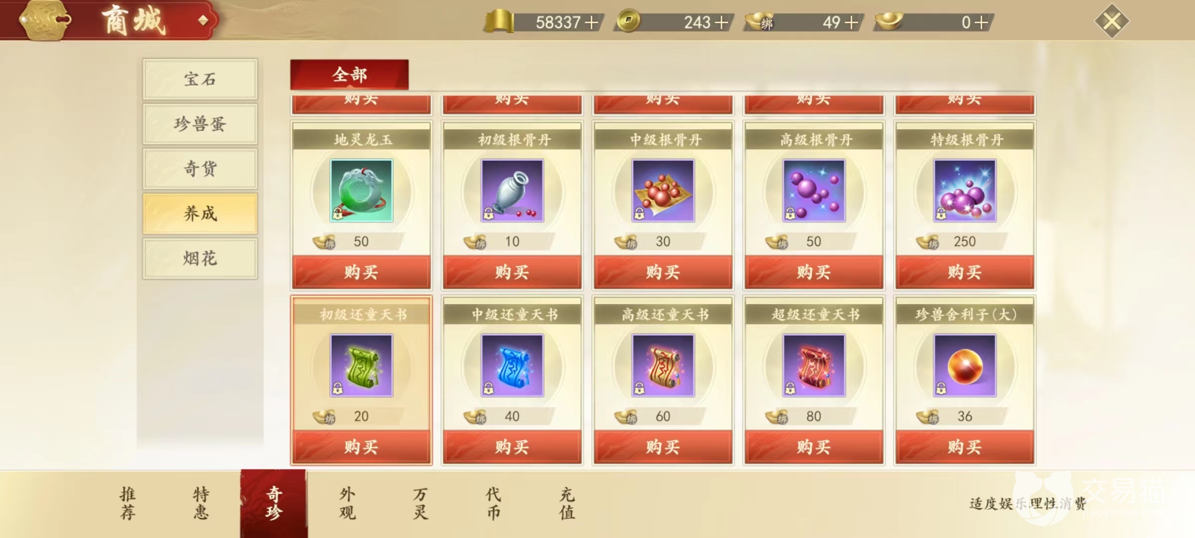 根骨丹除了商城能买到,在万灵商店也有出售,或者是去参加护岛神兽,击败之后获得根骨丹,藏宝图也有几率挖出。万灵商店要兑换道具需要用到万灵石,在义满天下活动中获得万灵石。还童卷轴和还童天书并不相同,卷轴可以在万灵商店兑换到,也可以参加宋辽大战获得,但是天书只能在商城中购买,或者是去参加拯救灵兽副本活动获取。