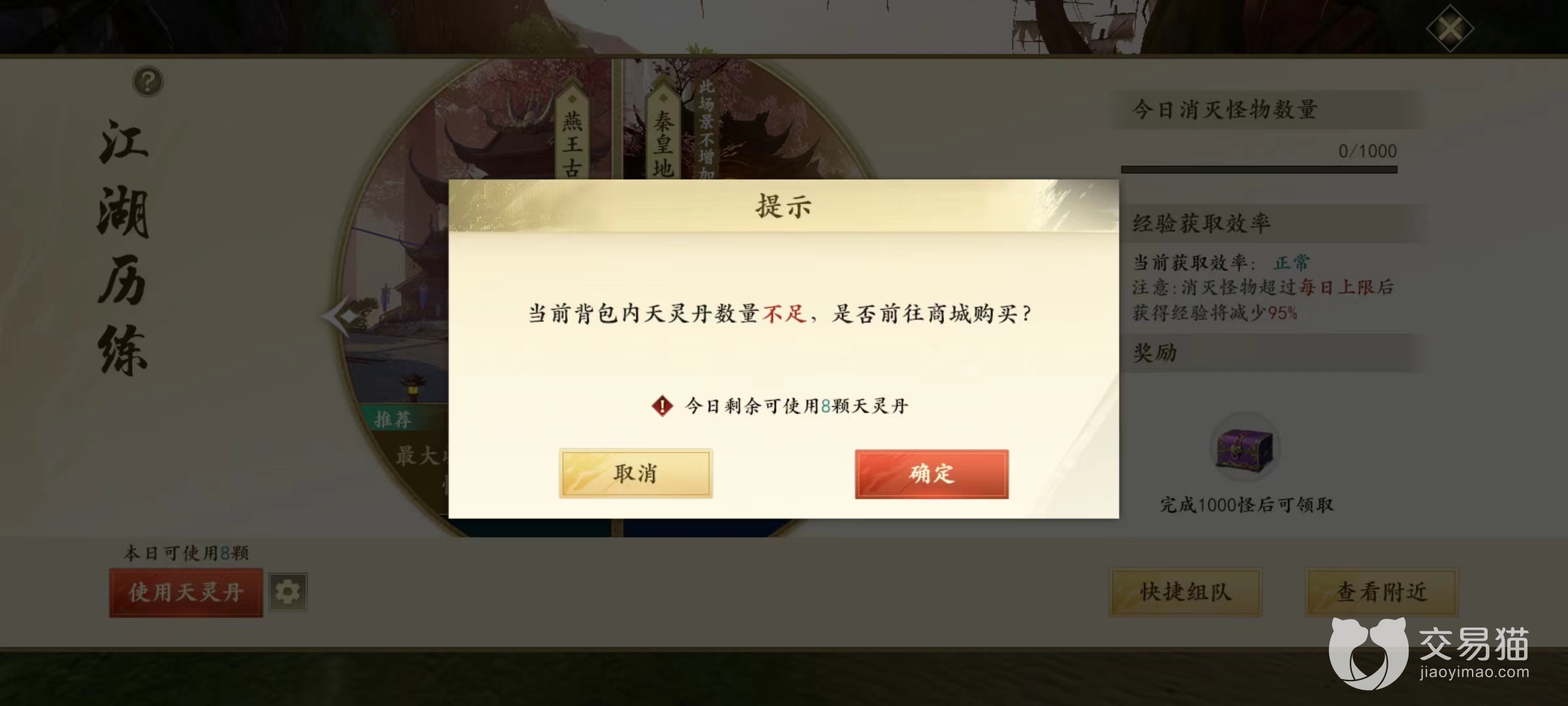 为了将奖励最大化,还可以使用下天灵丹,使用天灵丹之后获得双倍经验,消灭这里面怪物能够获得两倍经验,本来就已经非常丰厚,现在加倍以后更加可观。注意双倍经验并没有时间限制,每天登录或在线都会增加三次使用次数,最多能累计9次。
