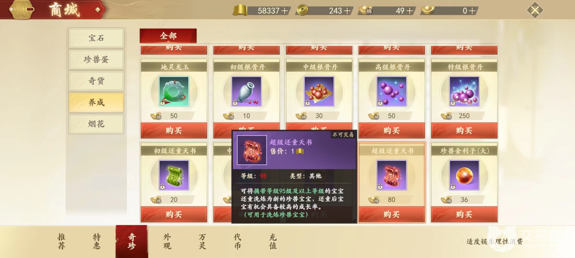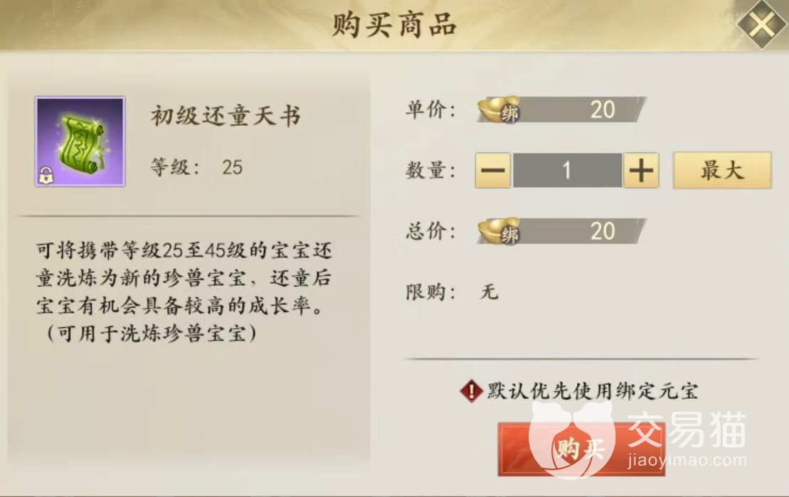 该道具同样按照所使用宝宝携带等级进行划分,从初级一直到超级,分别适用于不同携带等级宝宝。主要获取途径都是在商城里的养成环节购买,消耗的是绑定元宝,初级还童天书只需要20枚就能兑换一张,最高超级还童天书需要80枚兑换一张。而且还有限定等级,对于现在的玩家来说,如果达不到指定等级就不要去买,因为购买了之后也无法使用。