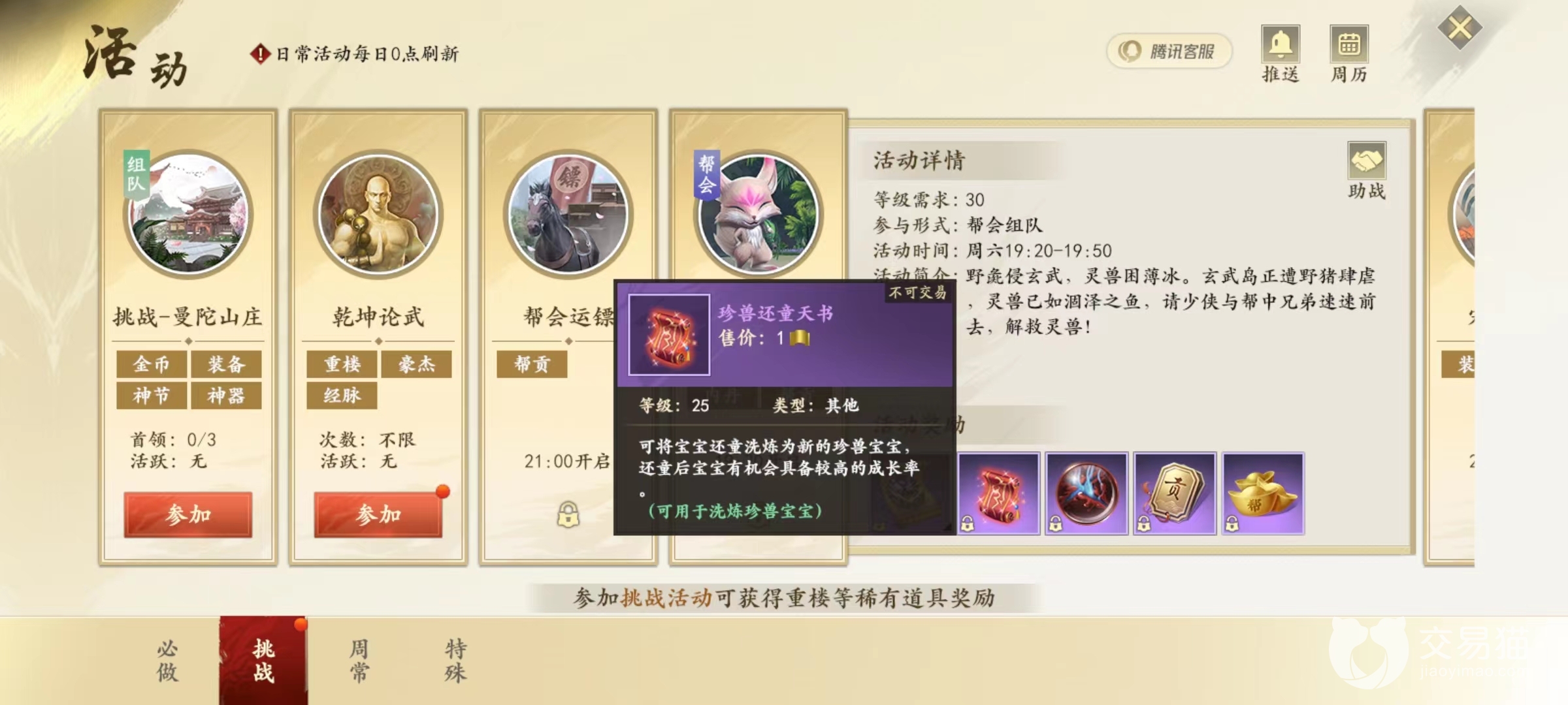 还有一项副本活动能够掉落,那就是拯救灵兽,这是需要帮会组队才能参加的限时活动,能够掉落很多灵兽培养相关道具,还童天书仅仅是其中一项,在战斗时候将会根据玩家当前等级掉落,如果等级较低就只能掉落初级卷轴,如果等级高可以获得更为高级类型。活动还能获得大量技能书、内丹和帮会资金以及帮派贡献等。