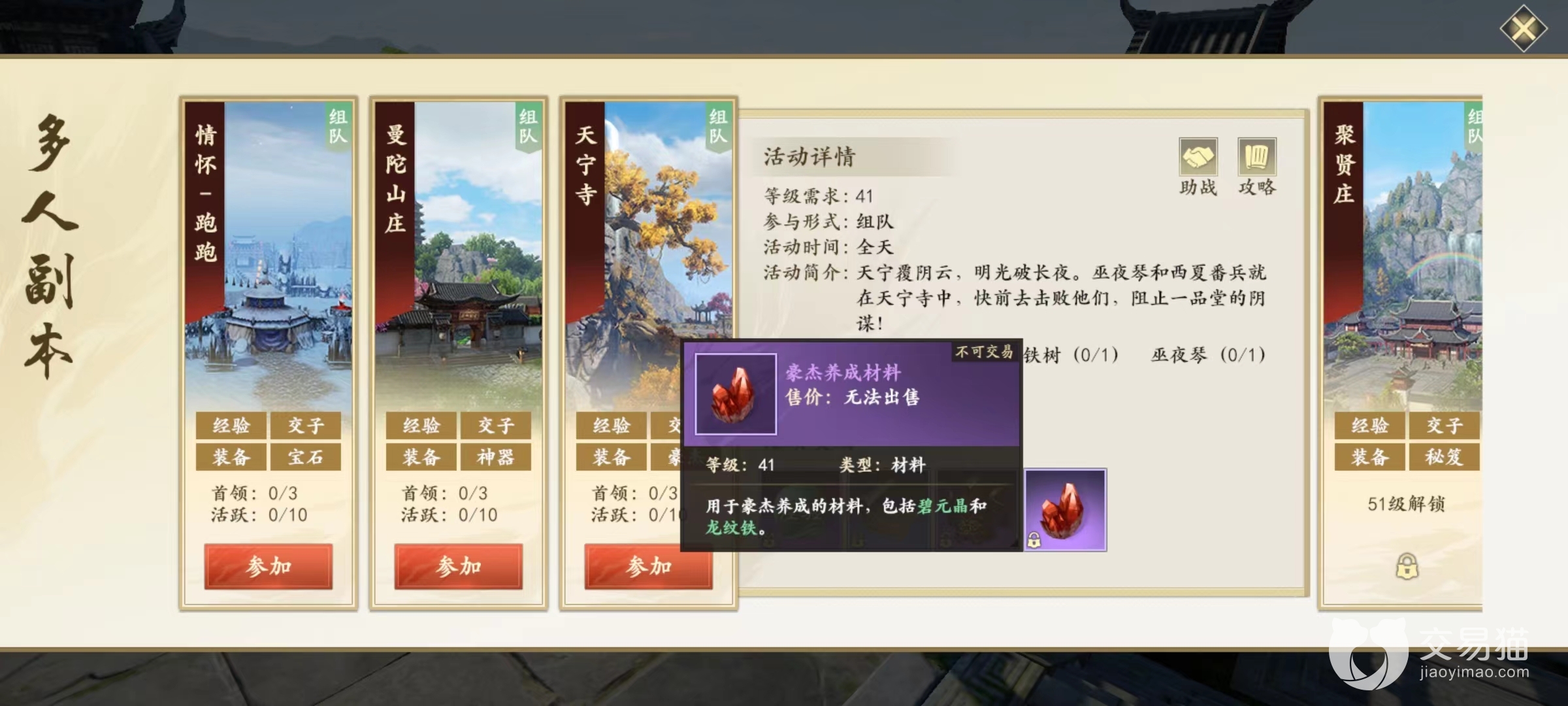 但是目前为止该道具非常抢手,所以在商会中很难购买到所需要的各种材料,有些长时间处于缺货状态,这就需要自己去获得。天宁寺和挑战天宁寺这两个副本并不是同一类型,天宁寺每天都会开放,可以随时参加,但挑战天宁寺必须等到系统开放时候才能够进入其中,难度更高奖励更丰厚。对于一般玩家来说,能将天宁寺打通,就有着不少豪杰养成材料获得。如果自己使用不到也可以在商城中出售出去,收益很可观。