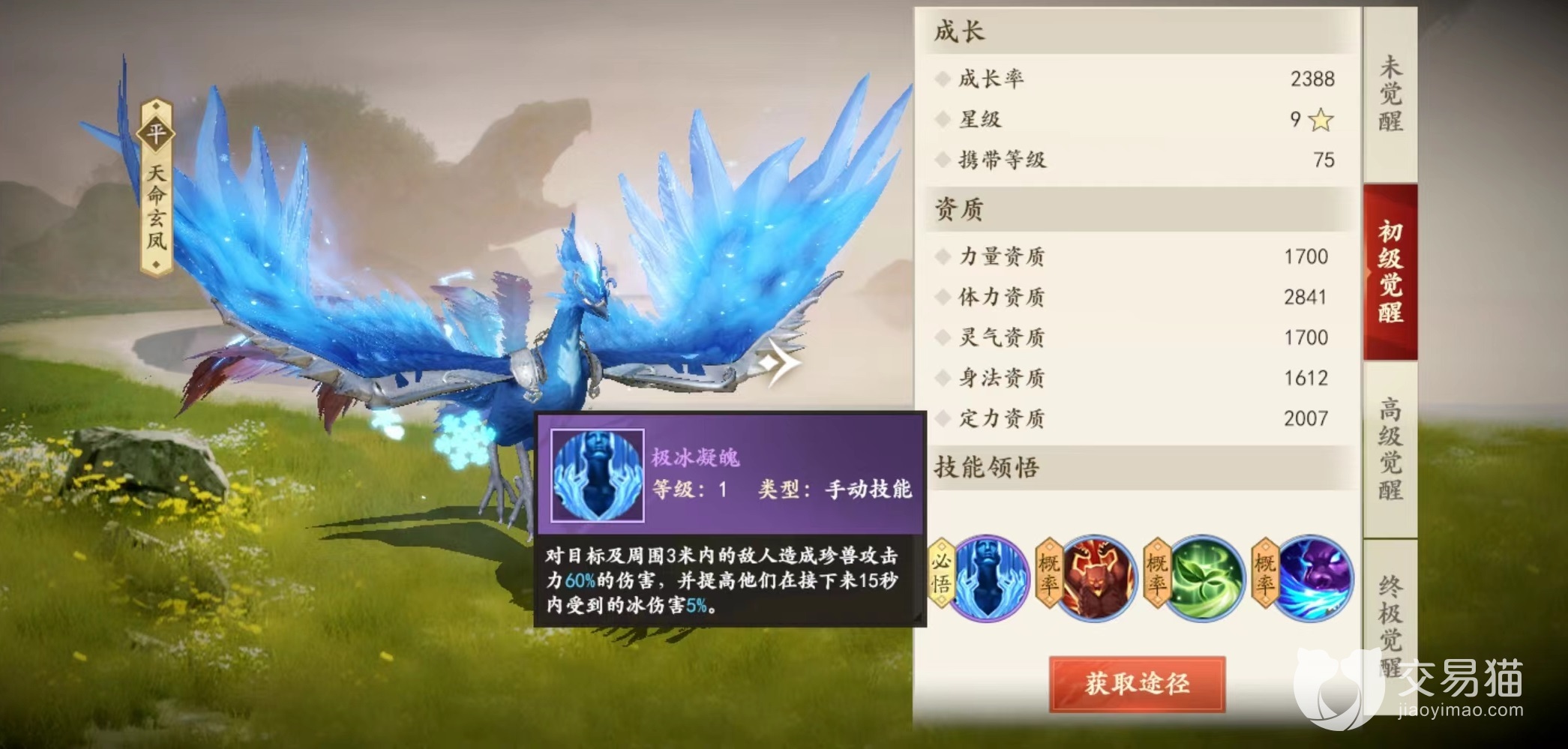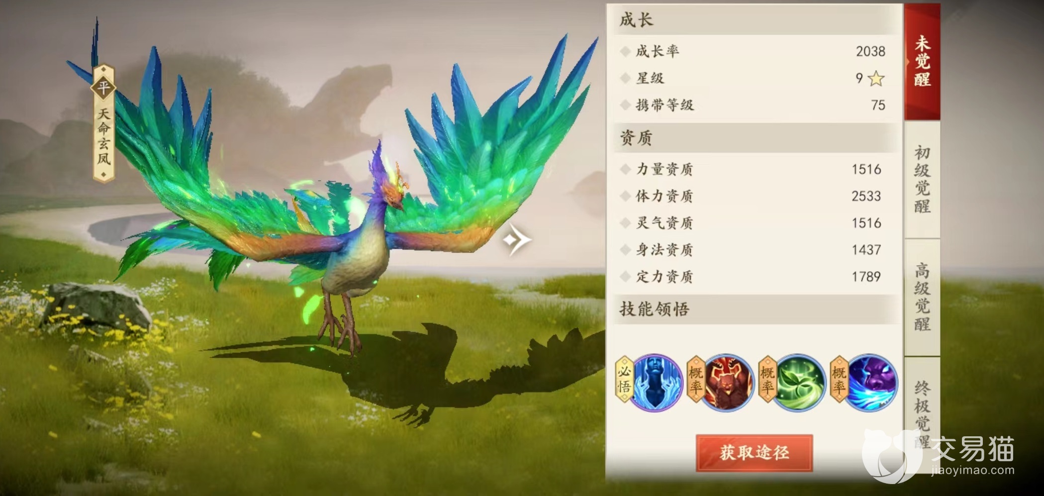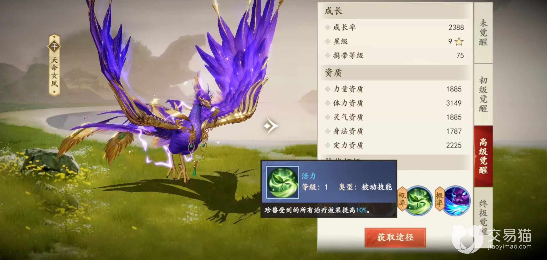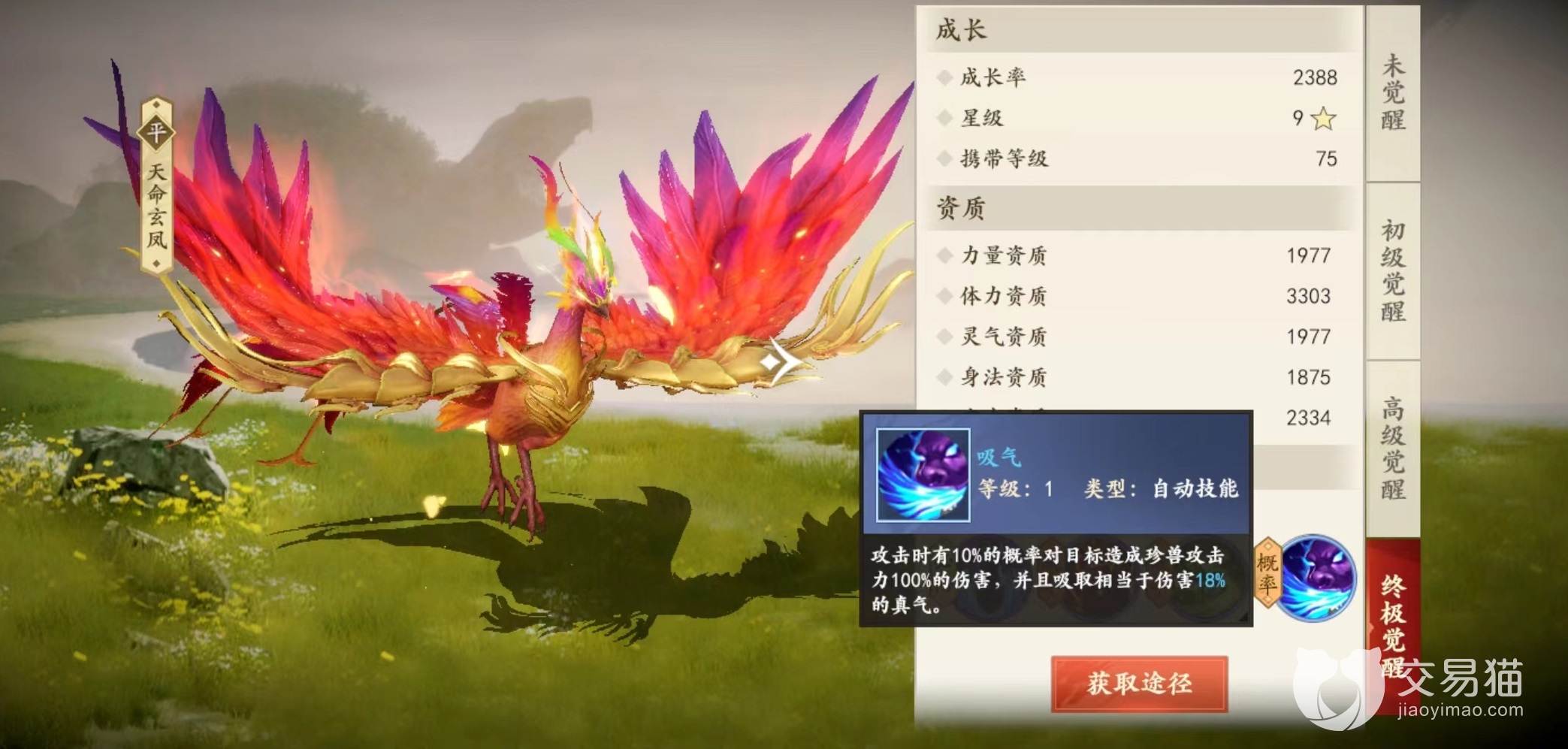 作为三大神兽之一,天命玄凤在提升方面可以进行三次觉醒,从最初获取的未觉醒阶段,一直到最后终极觉醒,每一次提升都是资质上的大幅升级。达到最后终极觉醒阶段,体力资质最多能达到3303,这已经是非常可观数字。在外观方面未觉醒时并不算特别抢眼,如同孔雀一般,但是达到最终觉醒之后,浑身散发着赤红色光芒,犹如凤凰非常炫酷。