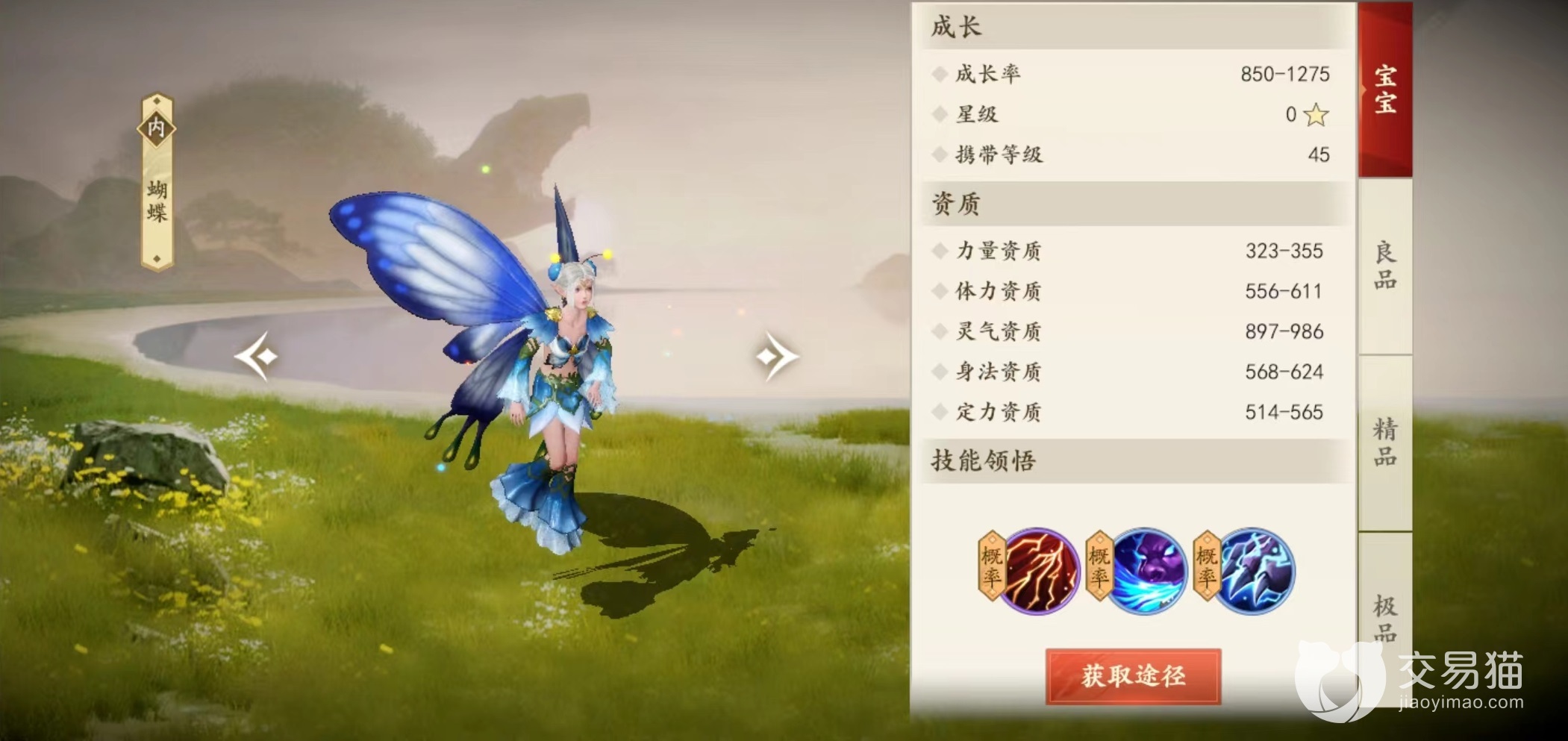 从宝宝时期开始,自身在形象上就有着非常漂亮的属性,达到极品阶段更是在色彩上更加鲜明,四周还有一些若有若无星点伴随,在颜值上优势极大。但光有外观还不够,资质和技能才是决定战斗关键所在。极品状态下的蝴蝶,自身灵气资质在1664~2216之间,考虑到45级携带属性,这样资质也能够接受。通过技能领悟可以获得玄雷击魄、吸气和玄雷咒这三个技能。