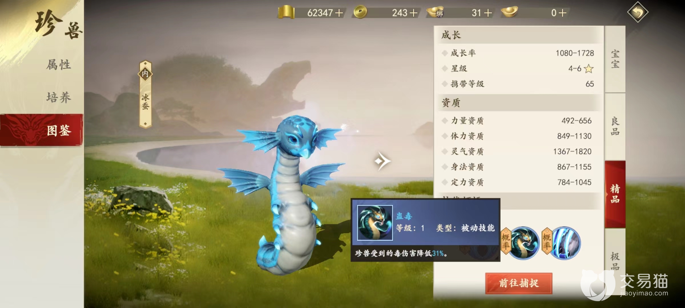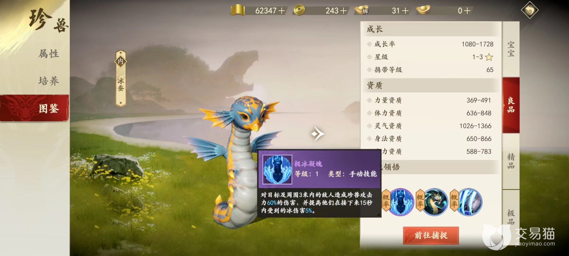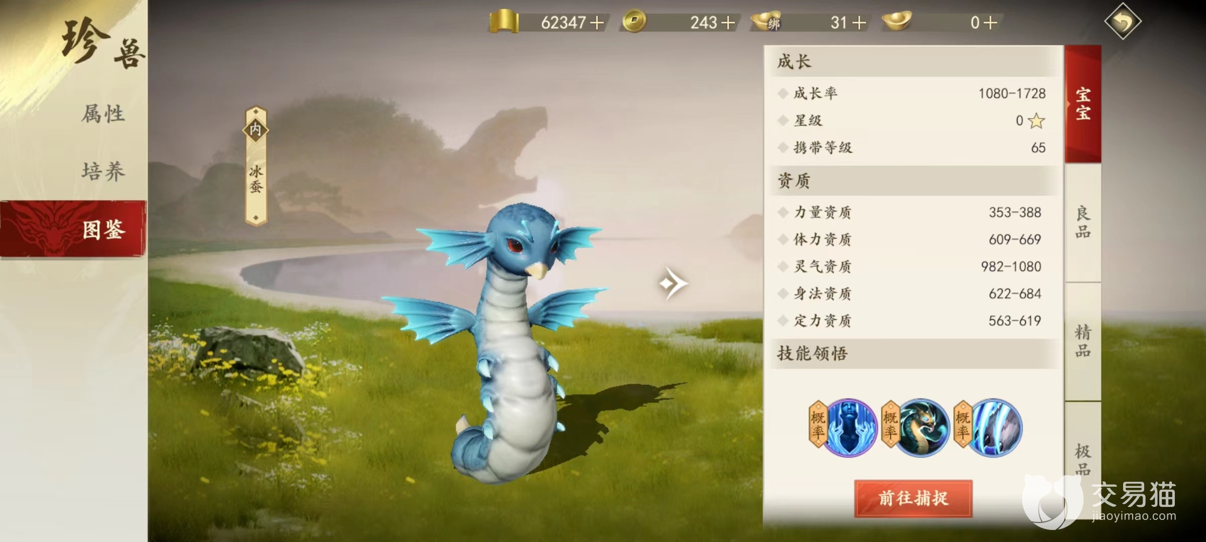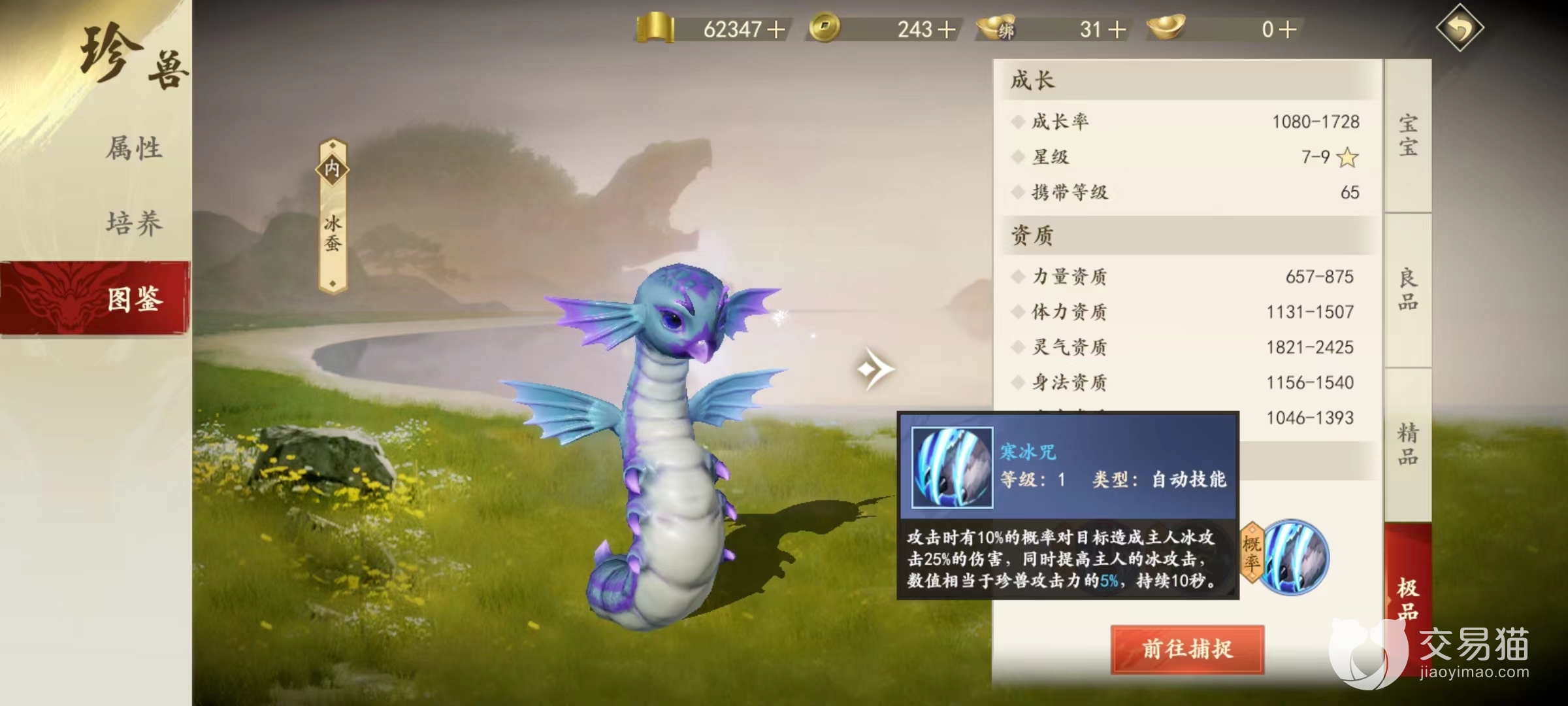 首先该宠物作为普通类型,自然在强度方面比特殊和神兽要低一些,但是现在可以直接通过捕捉来获得。这样有了充足获取途径,得到极品几率自然也更高一些,而且拥有数量多,繁殖起来也很简单。在外观形象方面没有太多特效,从宝宝到极品都是一样形象,只是在极品阶段多了一些雪花特效,颜色也更加鲜亮。资质方面达到极品时灵气资质为1821~2425,作为65级阶段宠物来说,还算中规中矩。