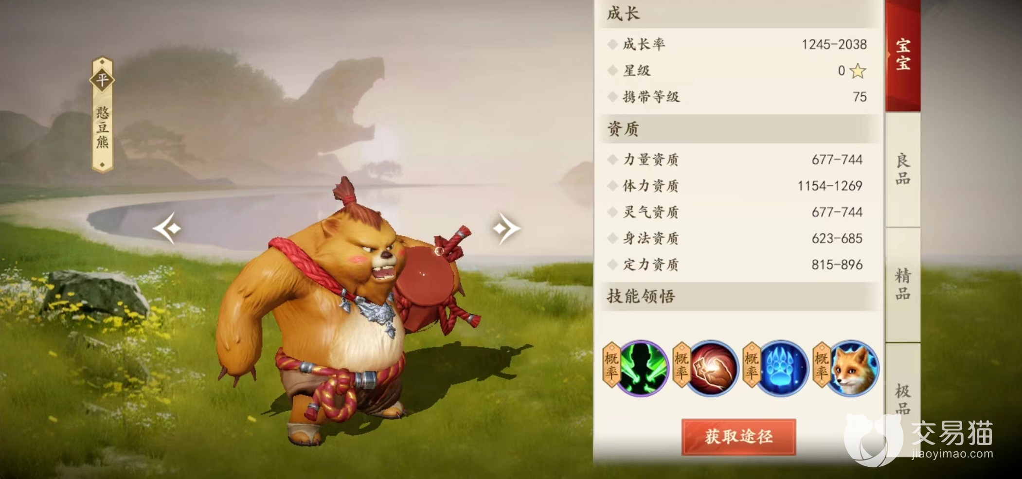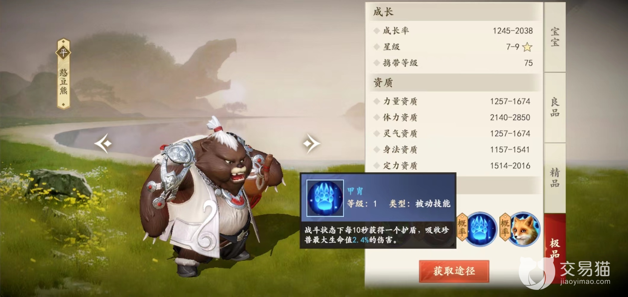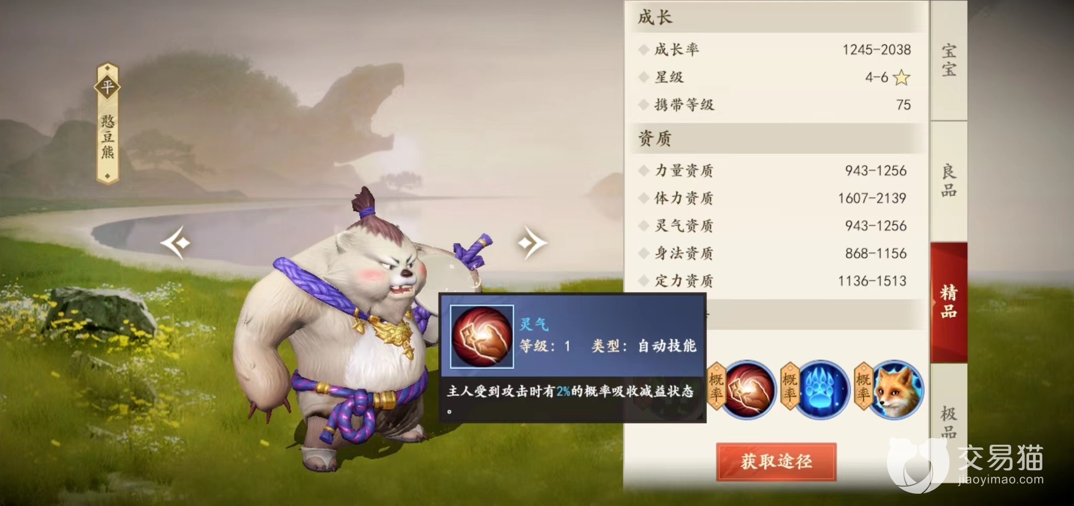 该角色在宝宝阶段外观就是一只非常可爱拿着酒缸的熊,但是到了极品阶段,身上就多了一些特效,浑身散发着若有若无的气势,身上服饰也变成了雪白色,比宝宝形态要犀利了很多。作为一名平衡型角色,自己擅长地方就在于体力,体力资质能达到2140~2850,定力资质也有1514~2016,所以在防御方面还是有着比较出色发挥。之所以称其为通用型,和技能效果是分不开的。