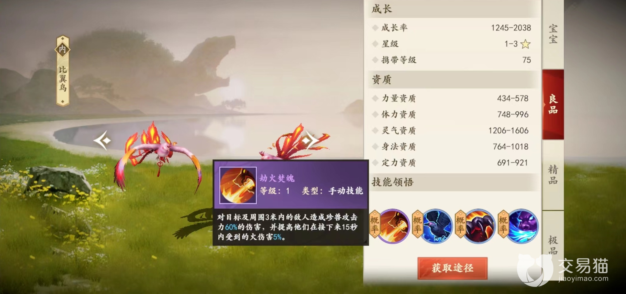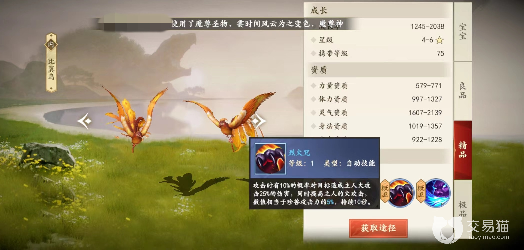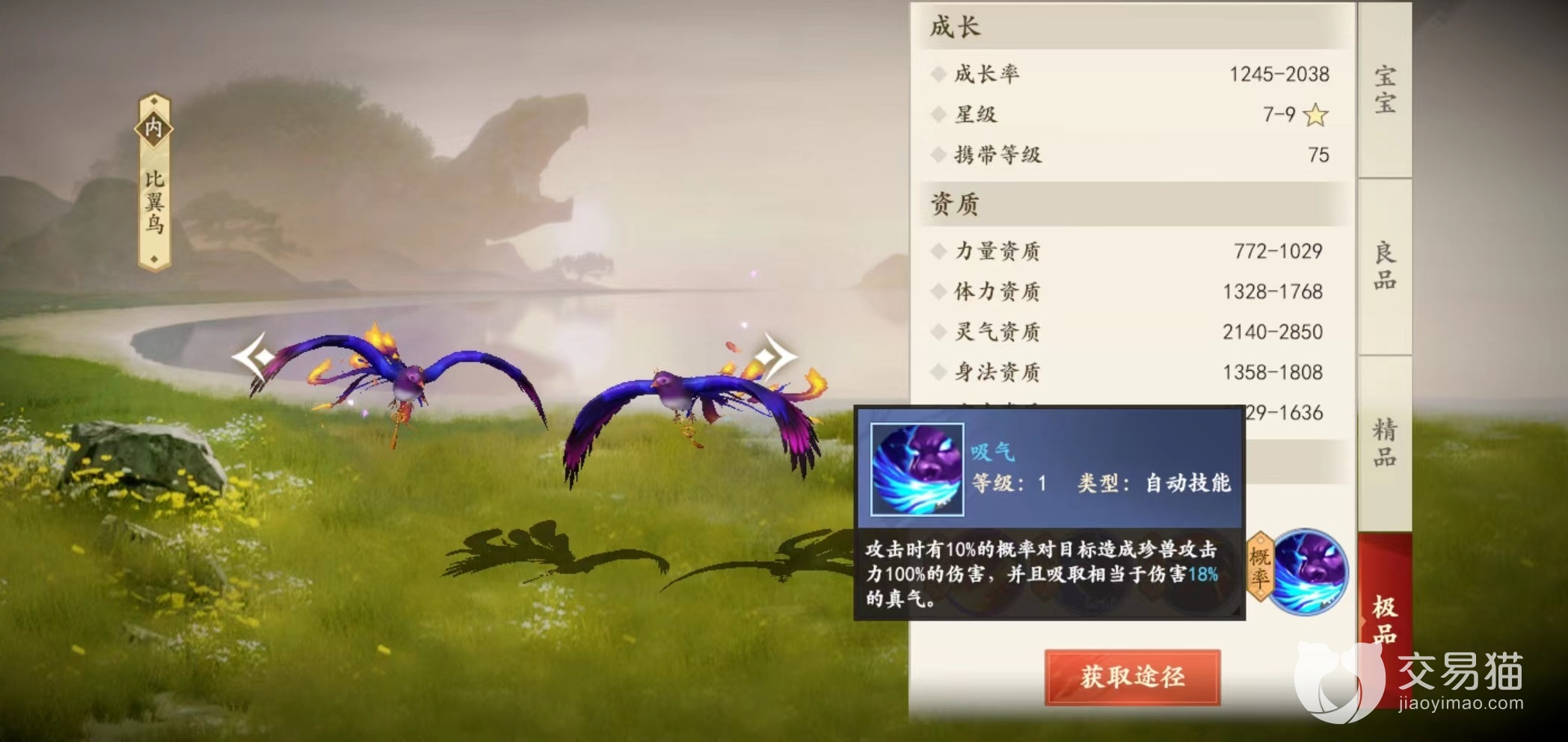 在游戏中不仅有各种神兽,还有很多其他宠物也是值得选择的,比翼鸟就是其中之一,一起来看下新天龙八部手游比翼鸟技能怎么样。对于珍兽来说,技能和资质缺一不可,只有全部具备才能真正成为战斗的帮手,所以必须要了解清楚,做出最合适的选择,尤其是到了高级阶段更是如此。
