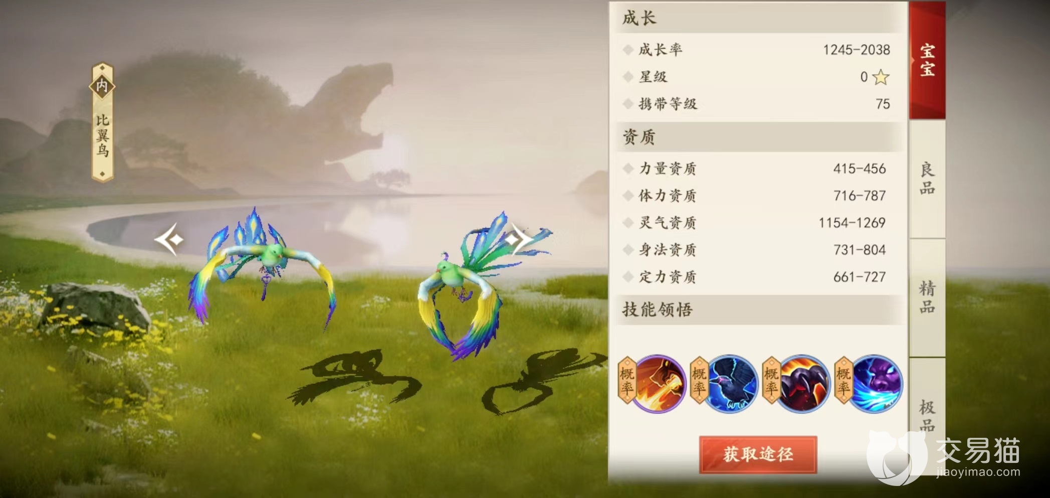 比翼鸟需要玩家等级达到75级时才开放携带,宝宝形态下比翼鸟外观很小,而且没有任何特色特效,当达到极品程度时,自身羽毛颜色更加鲜亮,尾部特效也更加明显起来。更重要是在极品状态下,灵气资质波动在2140~2850,如果运气好获得比较高的灵气资质,那么在输出方面也算较为可观。比翼鸟的选择有着很强的针对性,这和自身的技能是相关的。