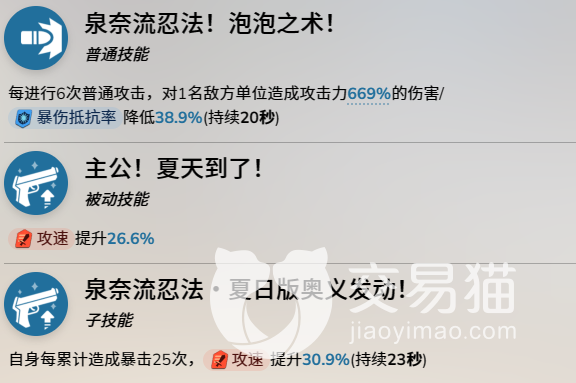 然后是久田泉奈【泳装】,她在总力战和高难关卡中的表现都为SS等级,但在推图过程中的强度等级只有B,原因和狐坂若藻一样,技能范围是单体。但在其余地形中,久田泉奈【泳装】的低费、集火加上降低敌方暴击伤害抵抗率的效果也使她的强度一跃提升至T0阶段。