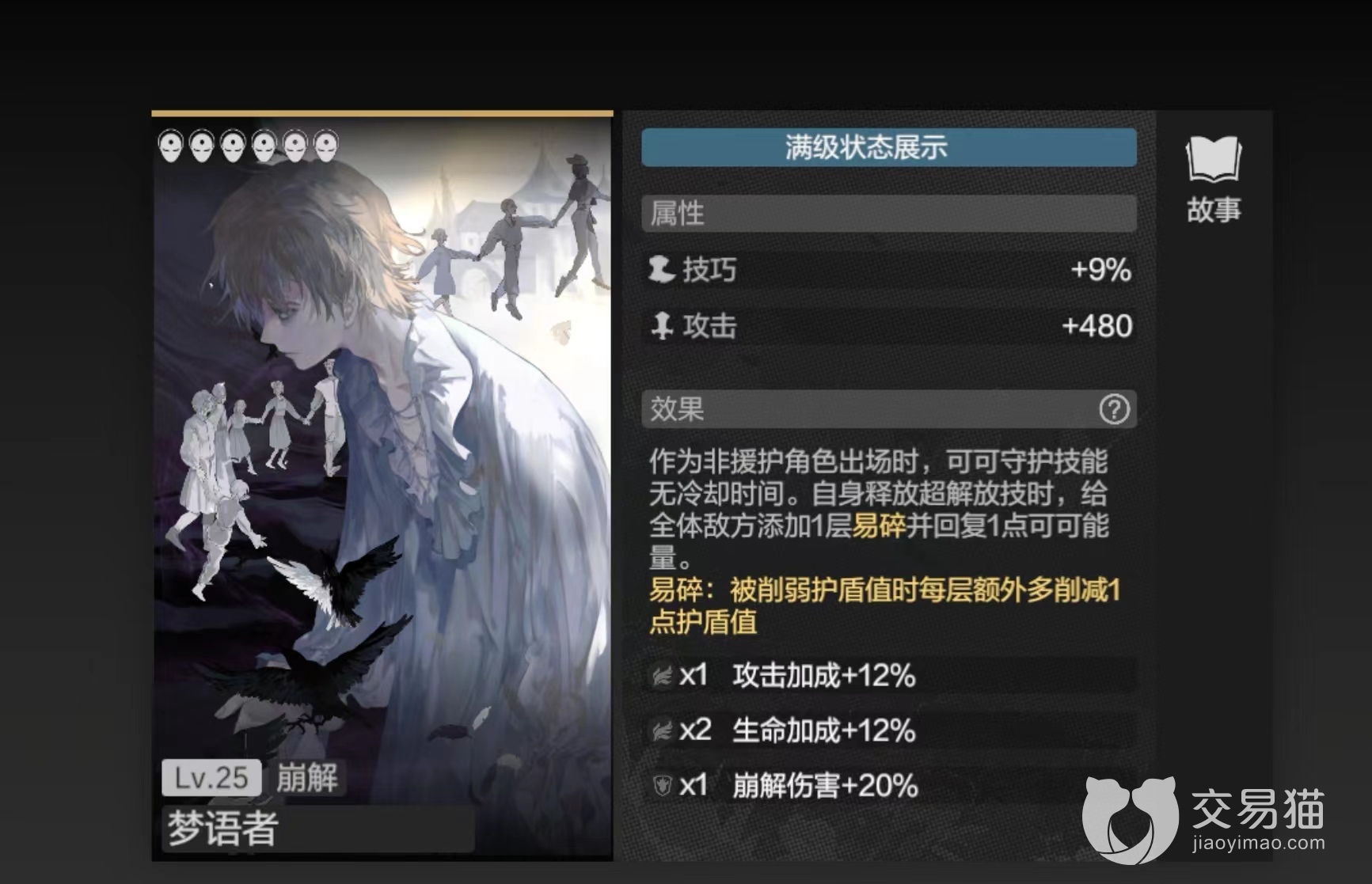 梦语者在满级的状态下可以提升至25,可通过相同的面具精炼提升能力效果,携带后队伍使用可可技能就不会再有一回合的冷却,只要可可能量足够就能连续使用,当援护型英雄携带该效果不生效。携带的英雄释放超解技可以给全体敌方施加1层易碎效果,被削减护盾的时候会额外减少1点。