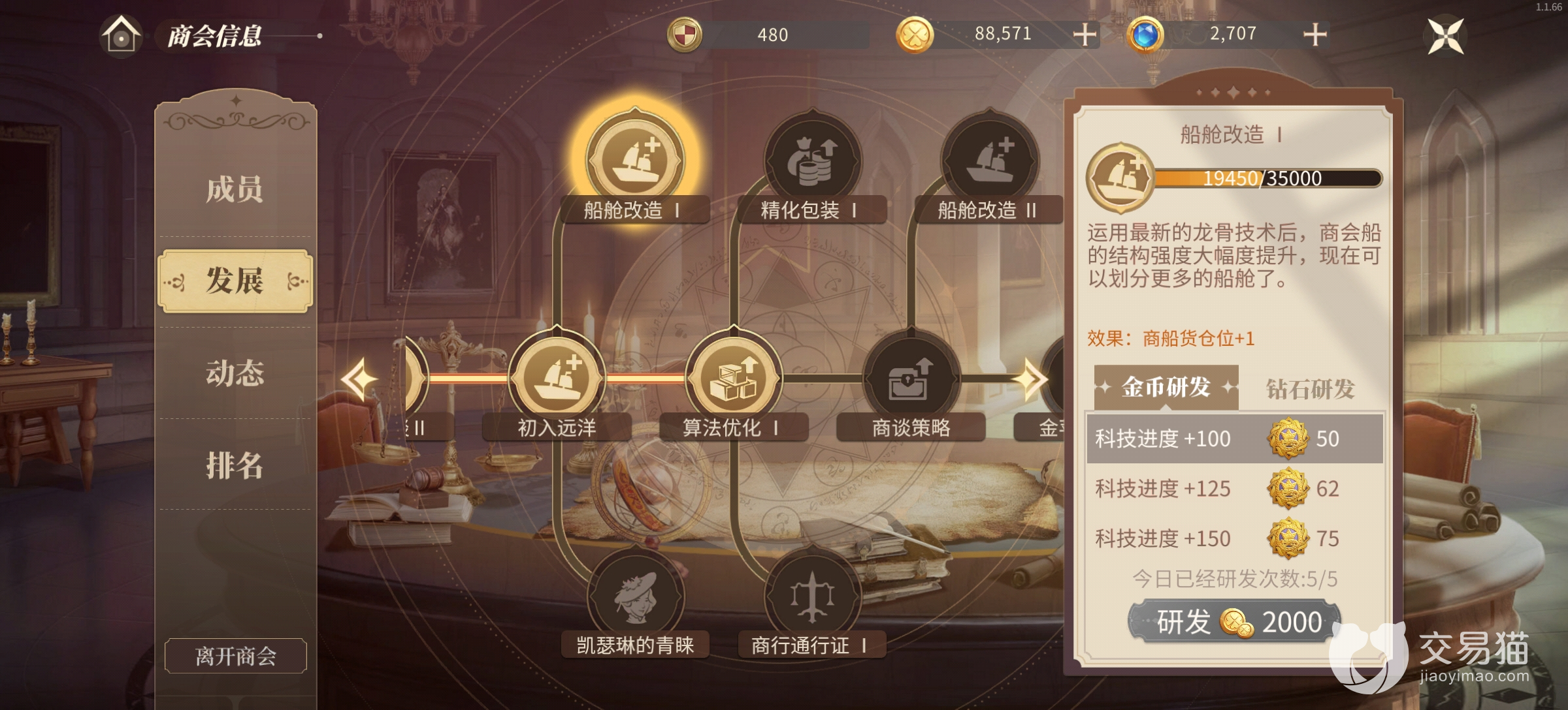 同时在等级达到一定程度的时候,会进行一个播报,商会成员都可以进行了解,商会中还有一个比较重要的地方就是商会发展,玩家们在商会系统中的【商报】页面就可以看到目前商会需要升级的种类,比如船舱改造,商会科技算法优化等等,可玩性目前看来还比较不错。