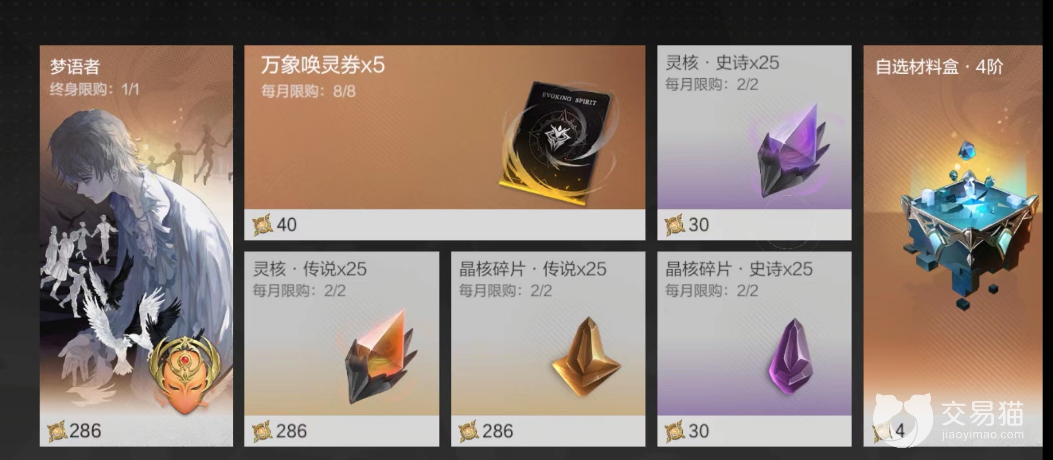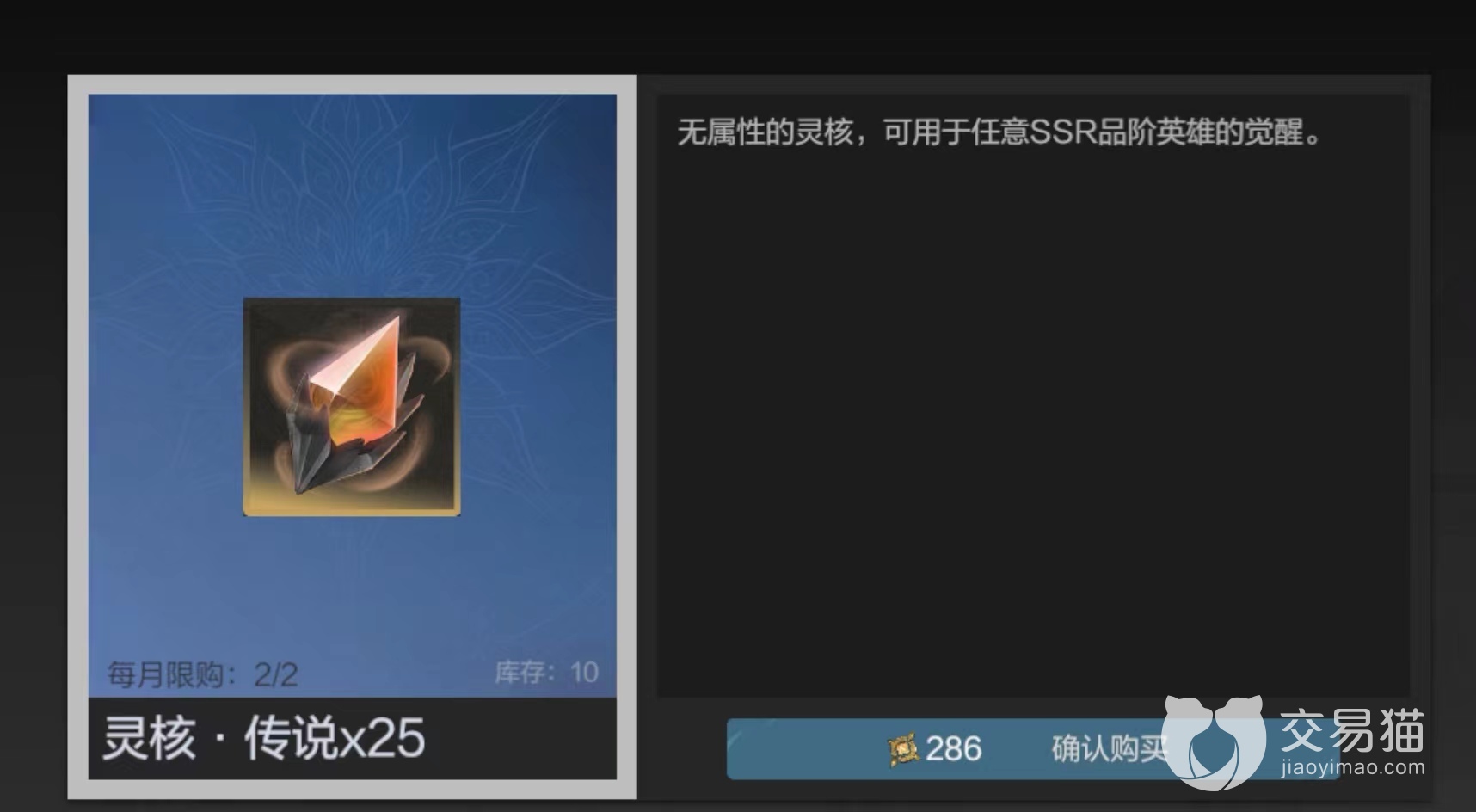 灵核目前有2个主要方法获取,其一大家应该在商店中发现了。兑换中心的万象唤灵石可以兑换传说级别灵核跟史诗级别灵核,传说级别的价值在286个万象唤灵石,可以换取25个,每月限购2次,合计50个传说灵核刚好够SSR英雄进行一次觉醒。史诗灵核是30个万象唤灵石换取25个,每月依然限购2次合计50个,通常玩家不会换取这个因为角色都可以抽卡。