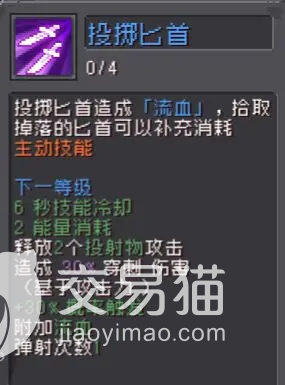 【投掷匕首】:盗贼咋进攻的时候会敌人投掷匕首,然后造成【流血】效果,同时如果拾取到掉落的匕首后,可以补充消耗掉的能量。这个技能需要6秒冷却时间,2点冷量消耗,会同时释放2个投射物,造成30%的刺穿伤害,但是投射2个的概率只有30%才会触发,而且会进行弹射1次。同时弹射的伤害也会附加【流血】效果。