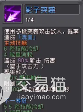 【影子突袭】:盗贼开启技能后会使用多段突袭攻击敌人,对敌人造成90%的斩杀伤害,同时有20%的概率造成【流血】效果,需要6秒冷却时间和4点能量消耗。