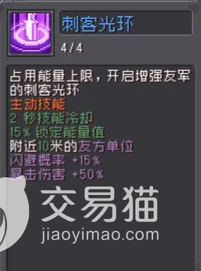 【刺客光环】:这个技能会占用能量的上线,开启一个增强友方的刺客光环,需要2秒的技能冷却时间,15%的锁定能量值,增加附加10米友方单位15%的闪避概率和50%的暴击伤害。