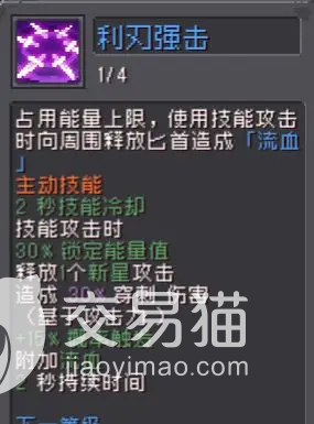 【利刃强击】:角色会占用能量上限,在使用技能攻击的时候会向作为释放匕首305%的刺穿伤害,同时有15%概率造成【流血】效果。在释放的时候会多释放一次新星攻击。流血效果触发后会持续2秒钟的时间。