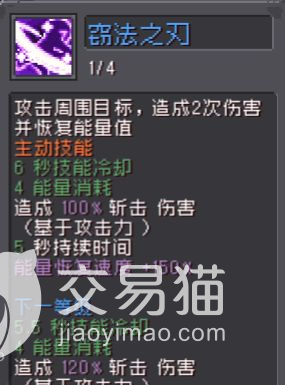 【窃法之刃】:刺客攻击周围目标的时候,会造成2次高达100%的斩击伤害,持续5秒,同时会回复自身150%的能量值,需要6秒的冷却时间与4点能量值的消耗。