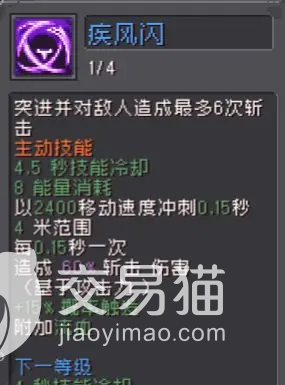 【疾风闪】:刺客开启技能后会以2400移动速度对周围敌人进行突进0.15秒,然后对4米范围中的敌人以每0.15秒一次的攻击对敌人造成60%的斩击,有15%的概率触发【流血】效果。