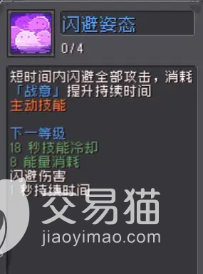 【闪避姿态】:这个技能在短时间内会闪避敌人全部的攻击,但是会消耗【战意】提升持续时间,需要18秒的冷却时间,8点能量消耗,闪避持续1秒,这个技能虽然看着非常强,但是持续时间太短,所以在释放的时候要对敌人的技能进行体验预判,如果刚好规避了敌人中致命技能的话,那效果还是非常不错的。