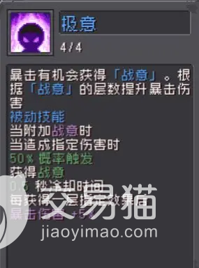 【极意】:这个技能其实就是主动技能中【战意】的被动,刺客在攻击的时候如果对敌人的攻击产生了暴击效果,就有50%的概率获得【战意】,而且角色的伤害会随着【战意】的层数而提升5%的暴击伤害,而且只有0.5秒的冷却时间。