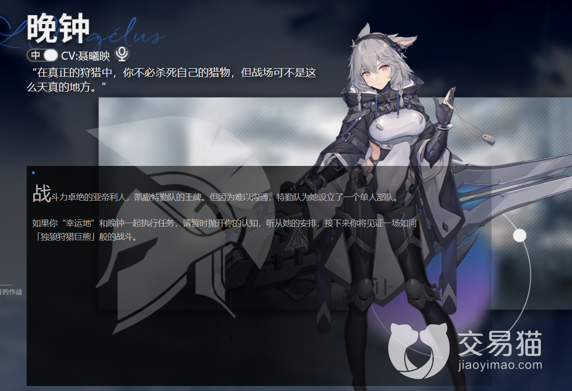 晚钟是一名岁数不大的少女角色,因为具有亚地利人的血统,故而长这可爱的兽耳,但可千万不要小瞧她,在背景故事中她是组织中任务完成率最高的特请,而在游戏中她也是当之无愧的T0级别的输出手,被动技能无视敌方防御,造成的伤害几乎和真实伤害一样,这让她在boss战中有着出色的表现。