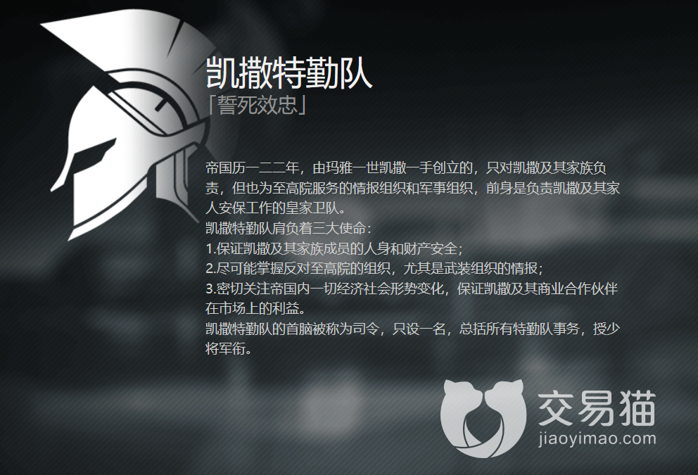在游戏中,一共分为主要的四个大势力,四个大势力的理念都不相同,但都是为了保卫人类世界而战,他们下辖的特勤也当然性格各异,首先就是凯撒特勤队了,这个组织是一个纯军事化的组织,认为只有将所有人类军事化管理后才可以集中力量客服异构虫的威胁,这个组织的特勤服从命令,对待敌人冷库的同时对伙伴又有浓浓的温情,代表干员当然是本作的看板娘——晚钟了。