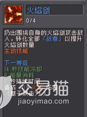 【火焰剑】:火焰骑士会扔出环绕在自身的火焰剑吗,并对敌人造成20%的【火焰伤害】,这个伤害会持续7秒钟的时间,技能需要14秒的冷却时间,共计8点能量点,在开启技能后会转化自身储存的【战意】,然后提升火焰剑的数量。这个技能可以优先进行升级,因为虽然是战士进行转变而来的,但是这个角色没有什么自保能力。